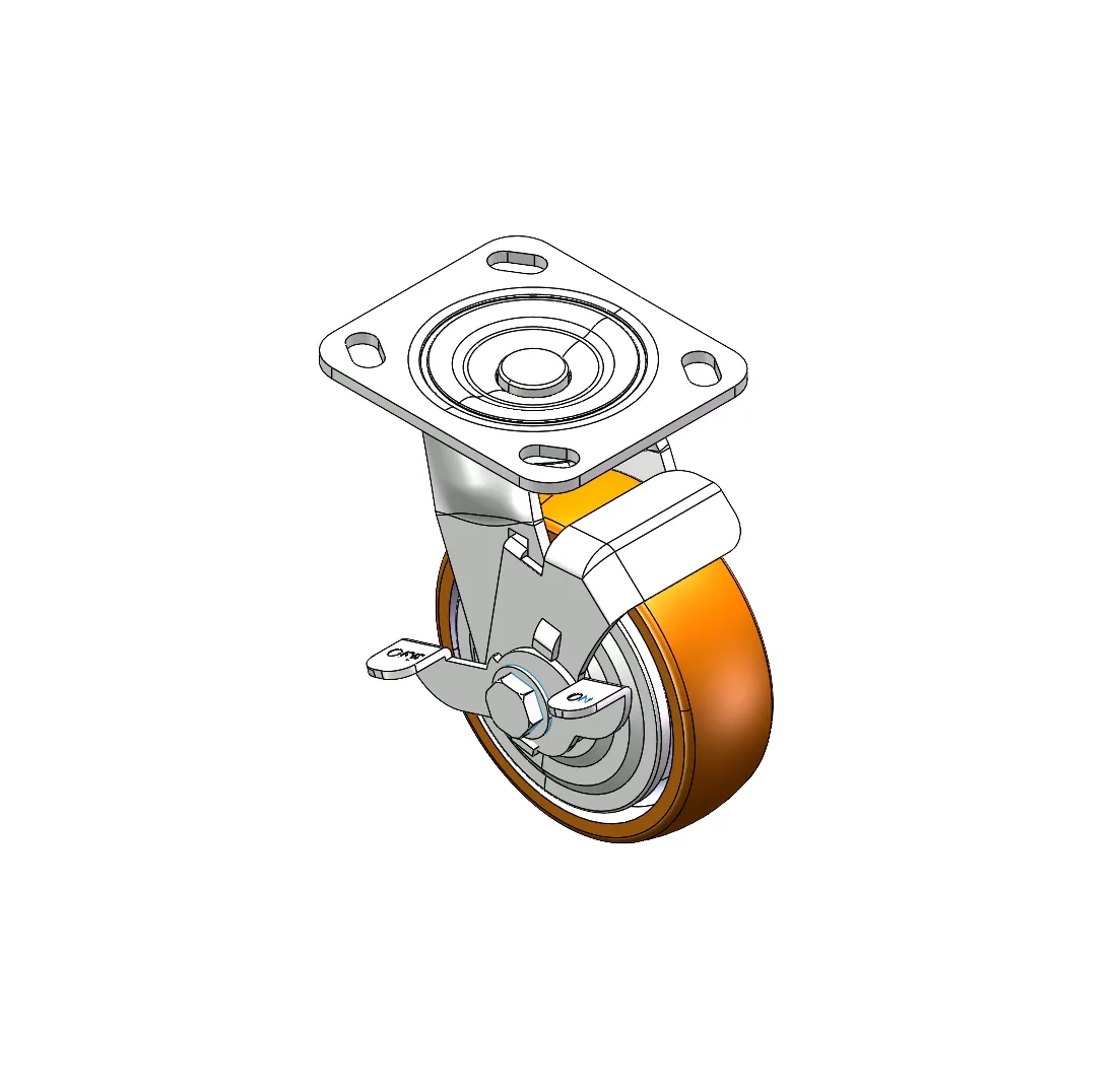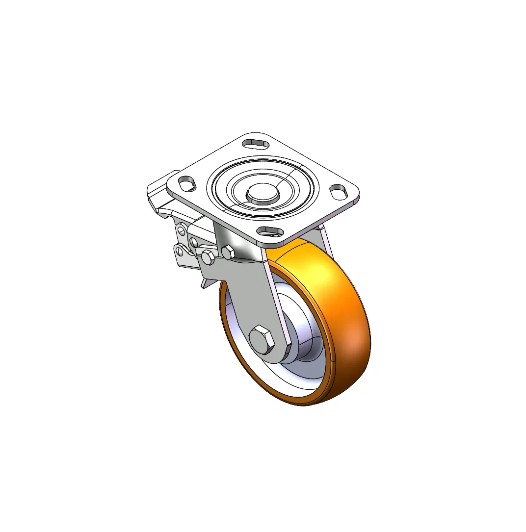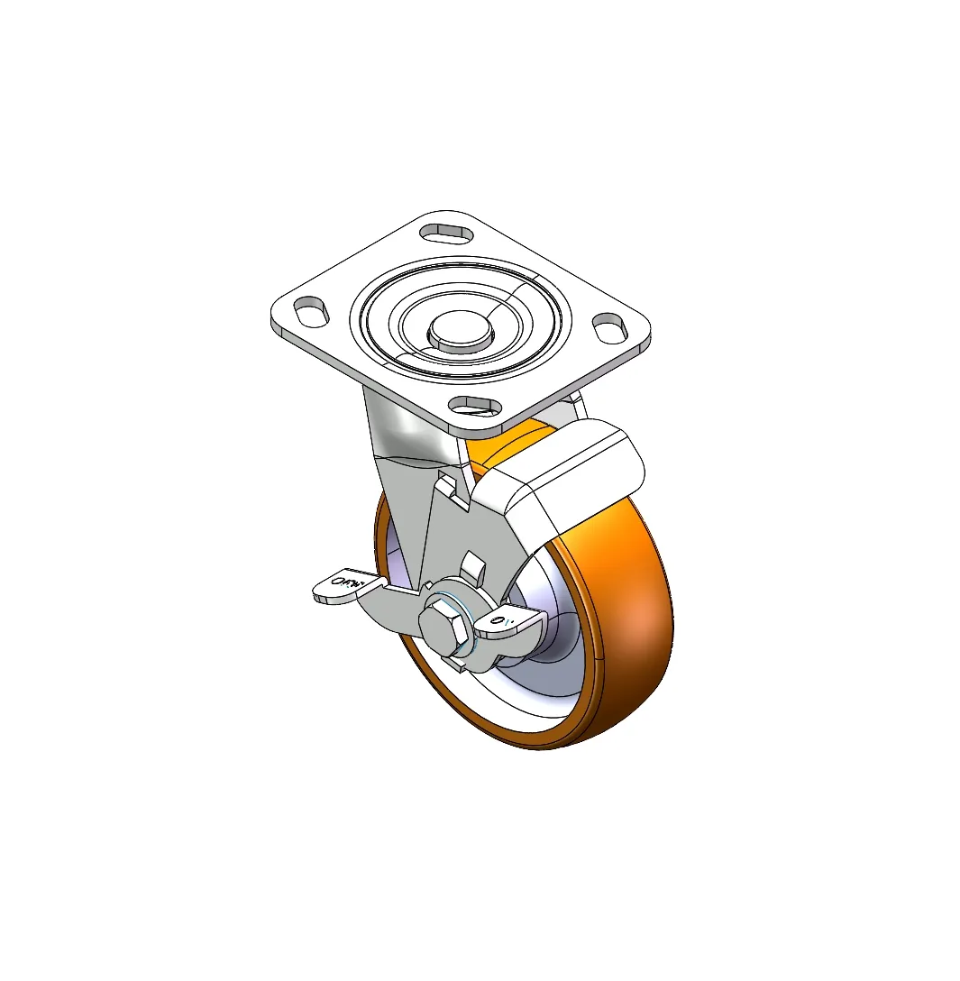 Side brake Caster with Locking system. Top Plate Riveted and Stamping - D-shaped. Hole Zine-Plated, Top Plate (4.5T) Mounting Type system Cast Iron Wheel Center with High Quality Polyurethane tread Iron brown, Bearing - Ball Bearing.