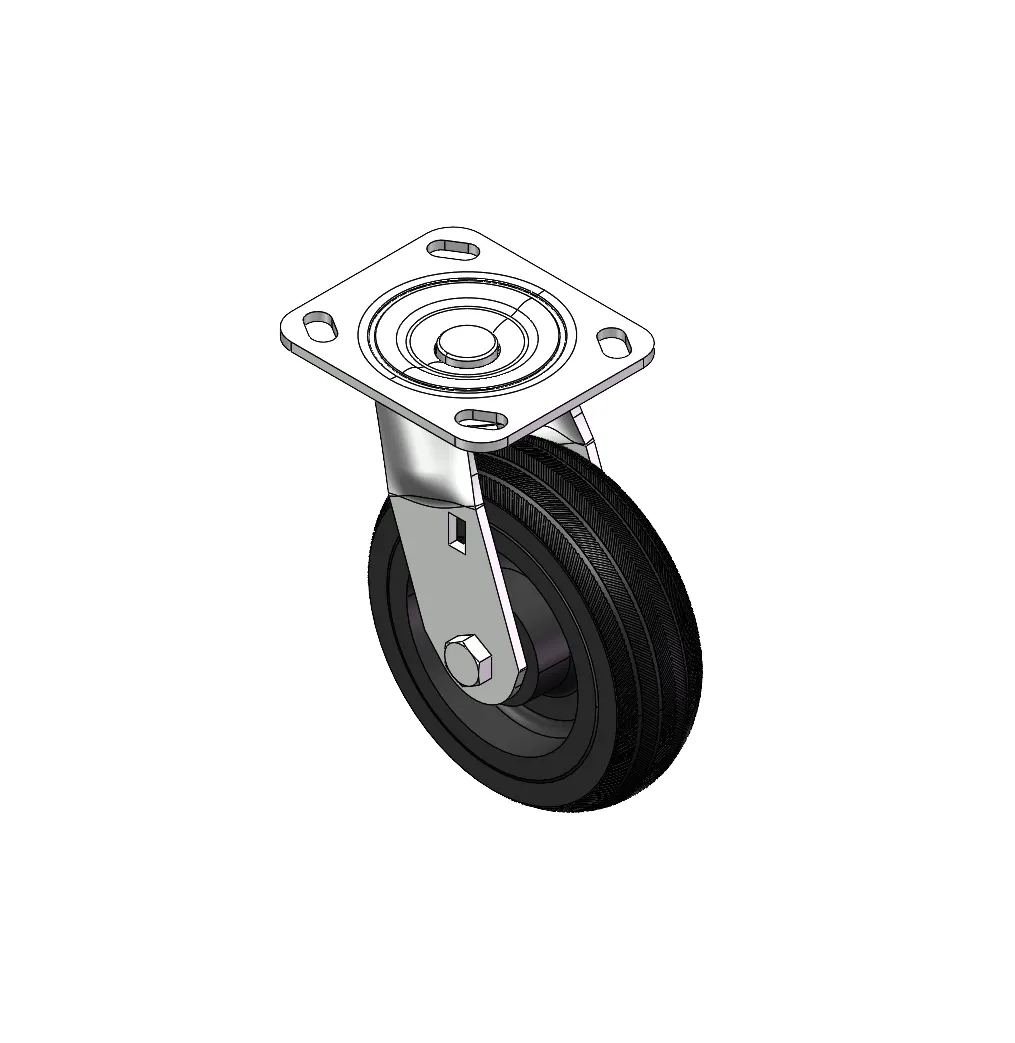 Swivel Caster with Riveted Fork and Stamping Fork with D-shaped hole. Zine-Plated, Top Plate (4.5T) Mounting Type system. Cast Iron Wheel Center with High-Quality Resilient Rubber tread. Iron black, Bearing with Ball Bearing.