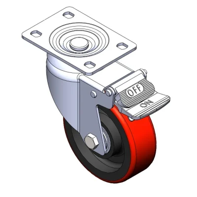 Bánh xe có phanh kép và hệ thống khóa. Đế bánh xe có chân đinh tán, dập và lỗ chất lượng cao. Hoàn thiện mạ kẽm, hệ thống lắp đế bánh xe (3T). Lõi gang với gai polyurethane chất lượng cao. Hoàn thiện phay đỏ, ổ trục bánh xe với ổ bi chính xác.