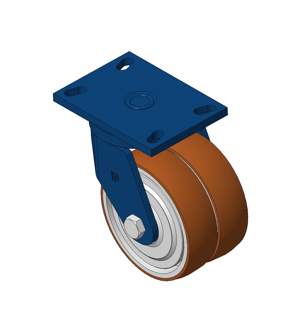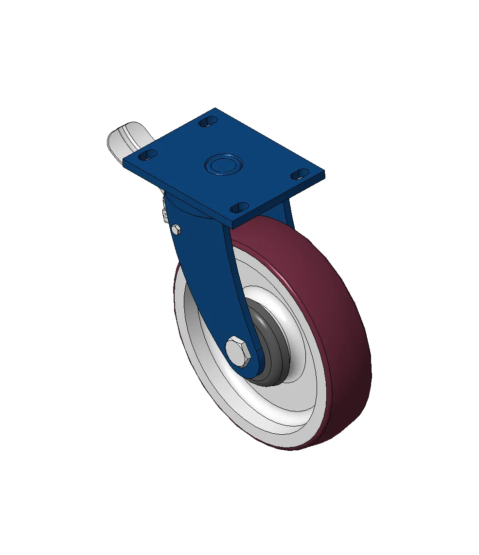 Bánh xe cố định với khung thép hàn và lớp sơn màu xanh.