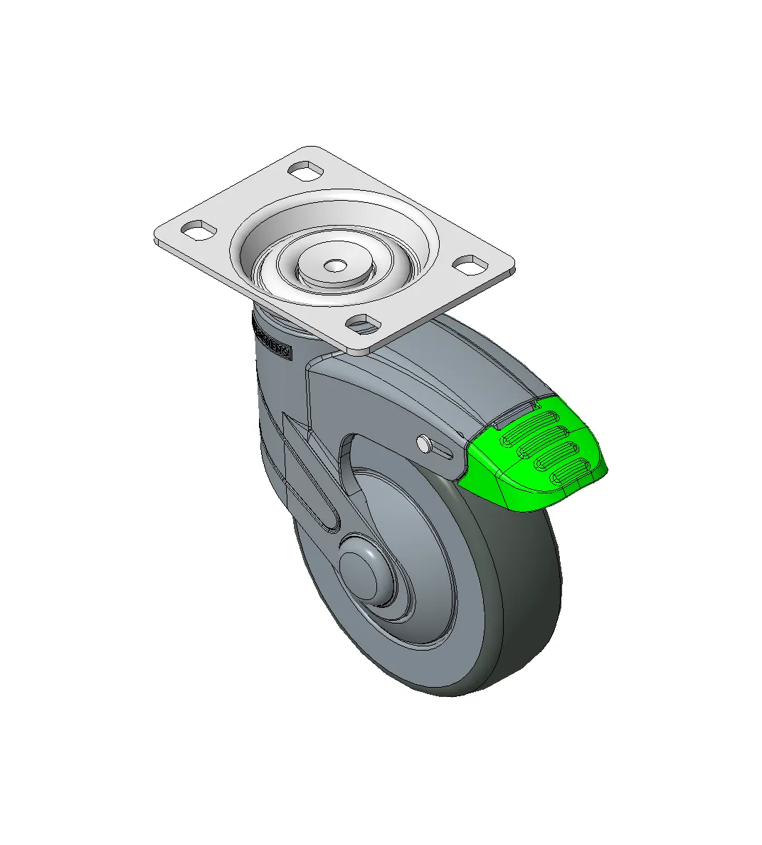 Bánh xe hiệu ứng toàn diện Được trang bị hệ thống khóa xoay và khóa đế cao cấp. Đế polyamide màu xanh, đế mạ kẽm, giá đỡ đế. Lõi bánh xe bằng polypropylene chống va đập, gai lốp bằng nhựa nhiệt dẻo đàn hồi (TPR). Vòng bi bánh xe màu xám đậm—vòng bi chính xác.