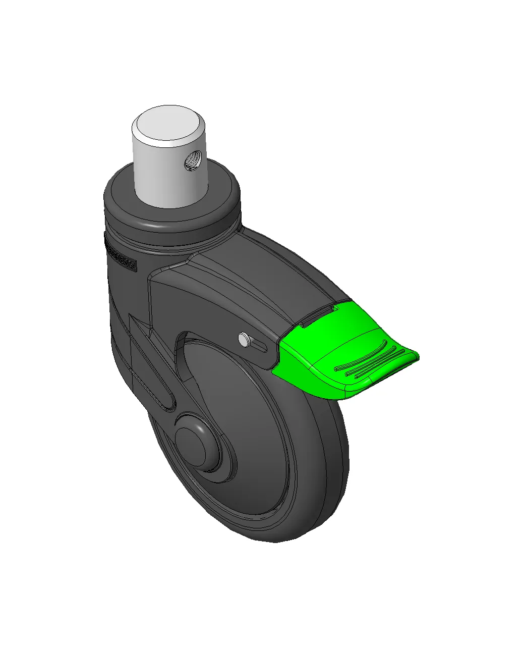 Chân bánh xe màu đen làm bằng vật liệu gia cố polyamide, lắp chốt định vị.