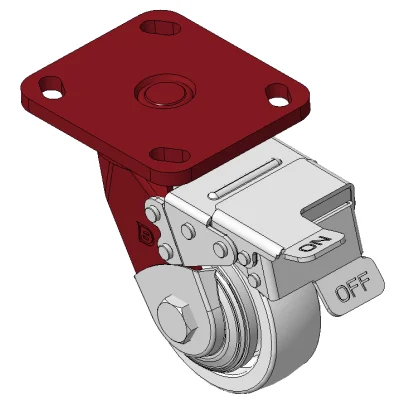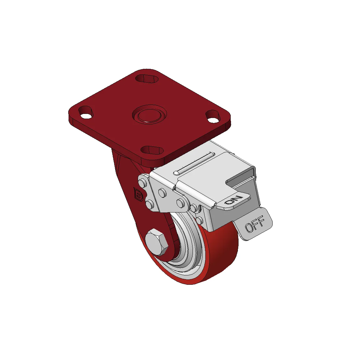Bánh xe có hệ thống phanh và khóa bánh trước, khung thép hàn Sơn đỏ, lắp đế, khoảng cách lỗ 85x70 Lõi bánh xe bằng gang, gai polyurethane chất lượng cao, phay màu đỏ Ổ bi bánh xe—ổ bi chính xác với nắp bánh xe chống quấn đặc biệt