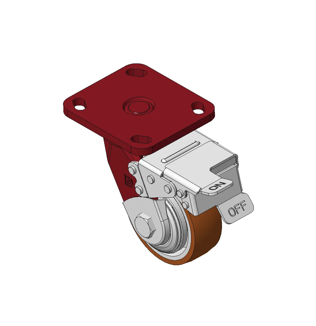 Bánh xe có phanh trước và hệ thống khóa, khung thép hàn Sơn đỏ, lắp đế, khoảng cách lỗ 85x70 Lõi bánh xe bằng gang, gai polyurethane chất lượng cao, phay màu đỏ Vòng bi bánh xe – vòng bi cầu chính xác