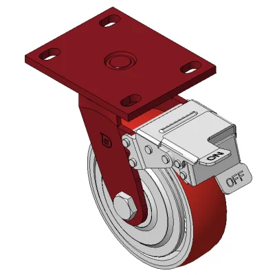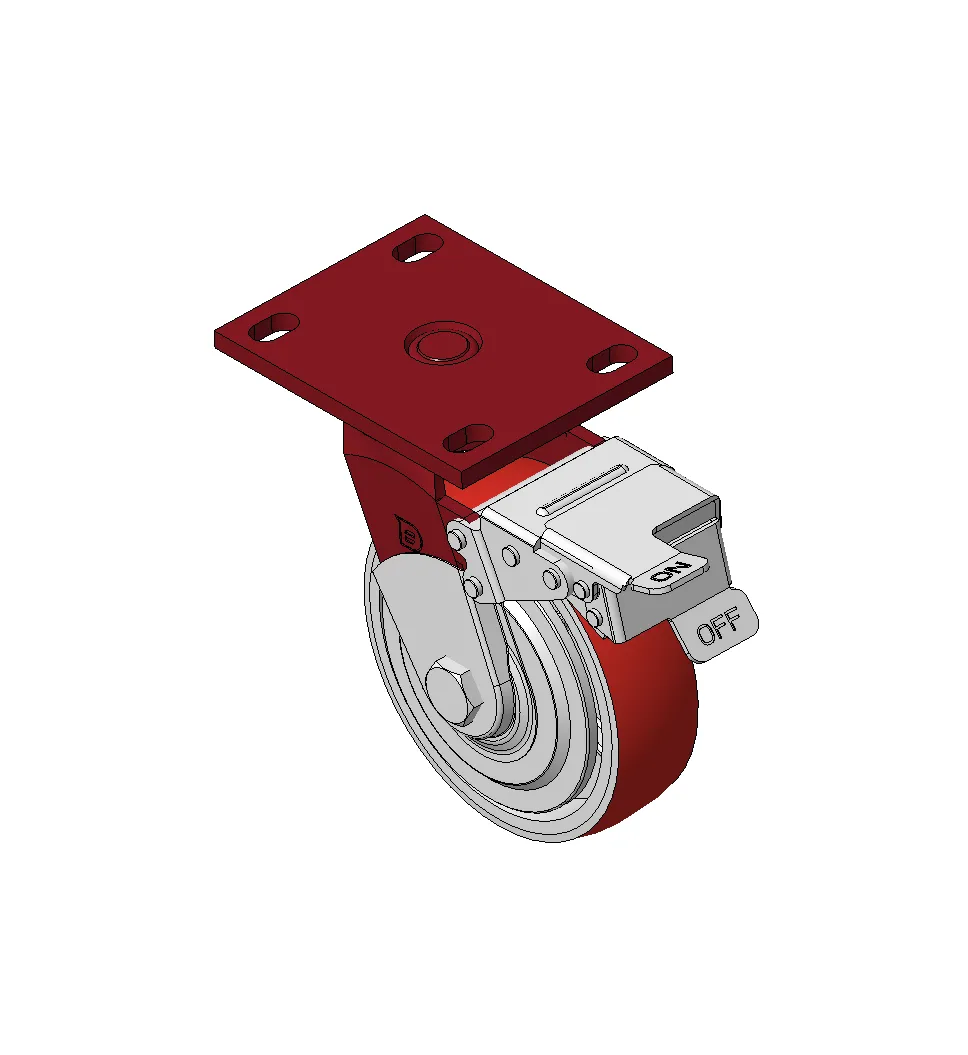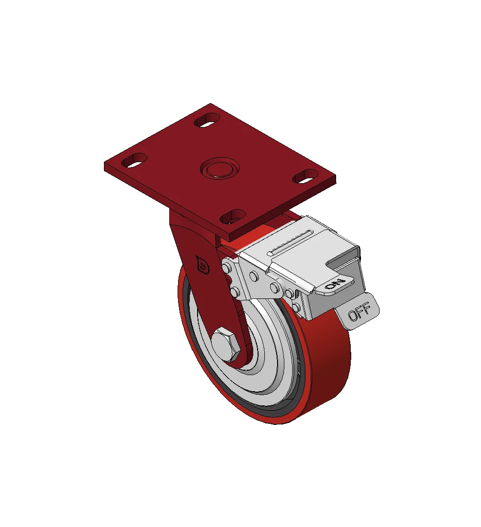 Bánh xe có phanh trước và hệ thống khóa, khung thép hàn Sơn đỏ, lắp đế, khoảng cách lỗ 110x75 Lõi bánh xe bằng gang, gai polyurethane chất lượng cao, phay màu đỏ Vòng bi bánh xe—vòng bi chính xác với nắp bánh xe chống quấn đặc biệt