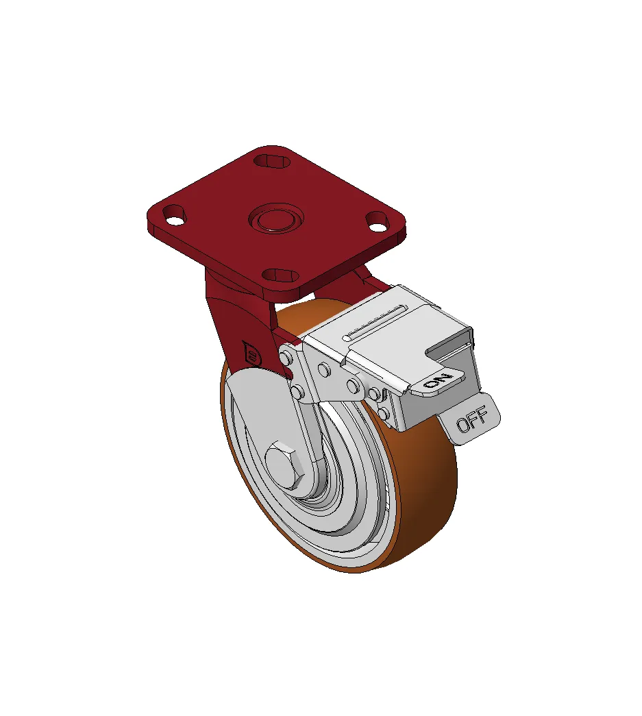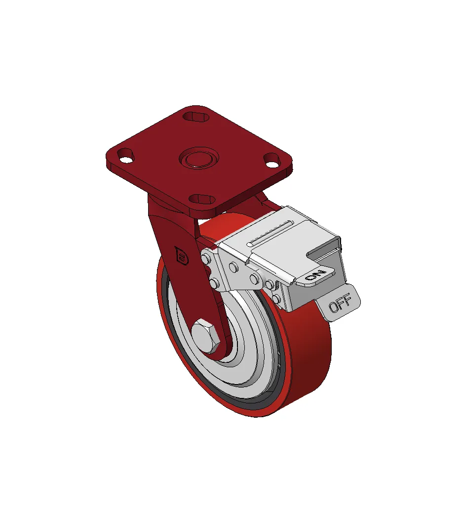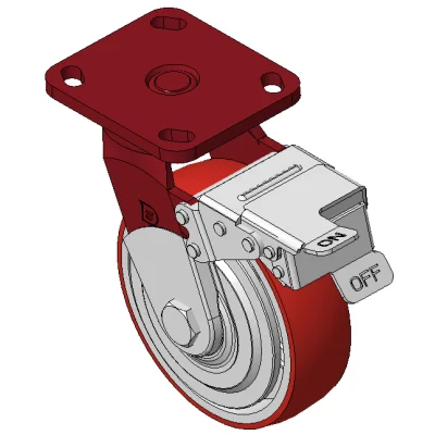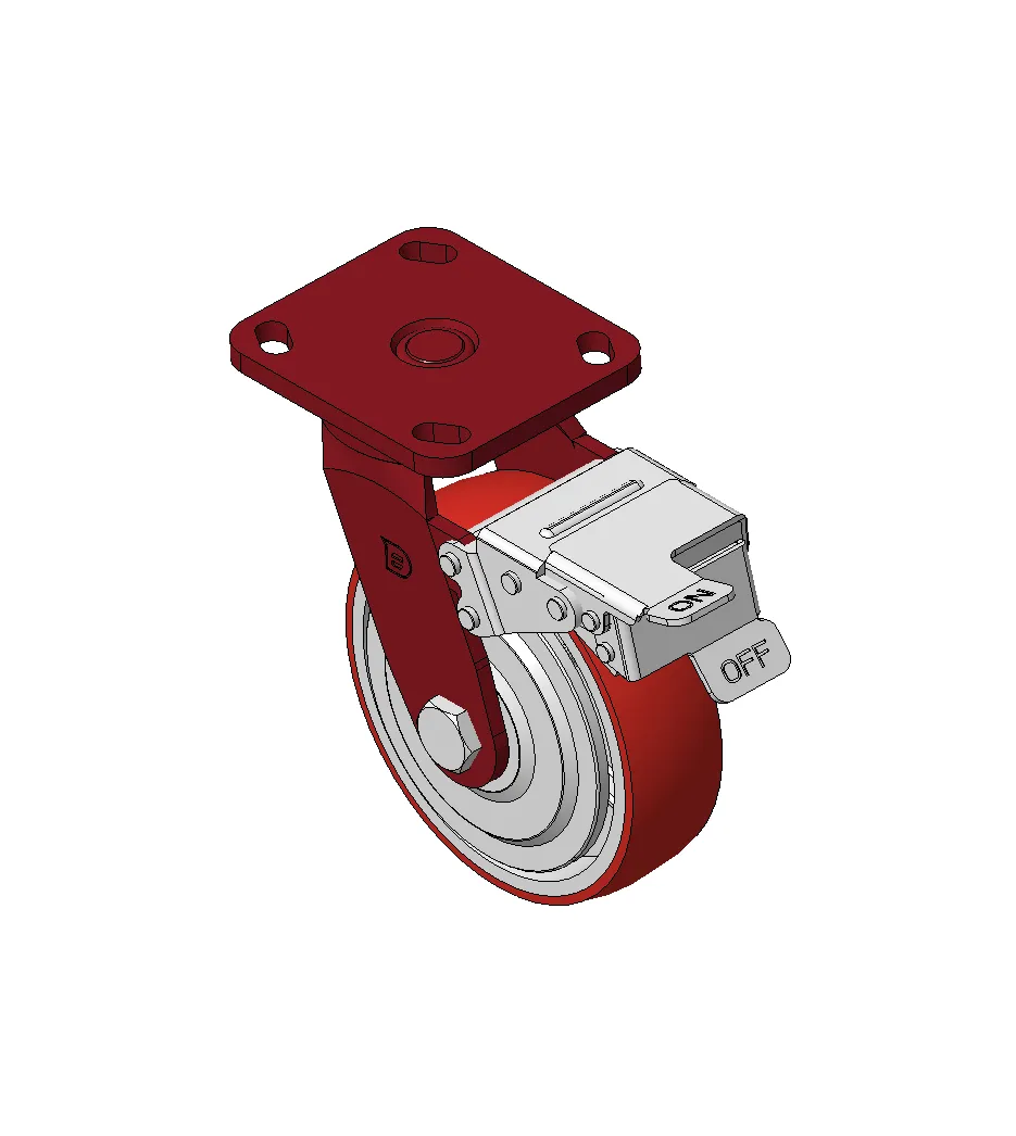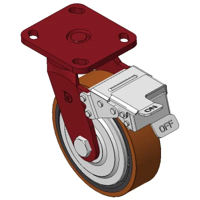 Bánh xe có hệ thống phanh và khóa bánh trước, khung thép hàn Sơn đỏ, lắp đế, khoảng cách lỗ 85x70 Lõi bánh xe bằng gang, gai polyurethane chất lượng cao, phay màu đỏ Ổ bi bánh xe—ổ bi chính xác với nắp bánh xe chống quấn đặc biệt