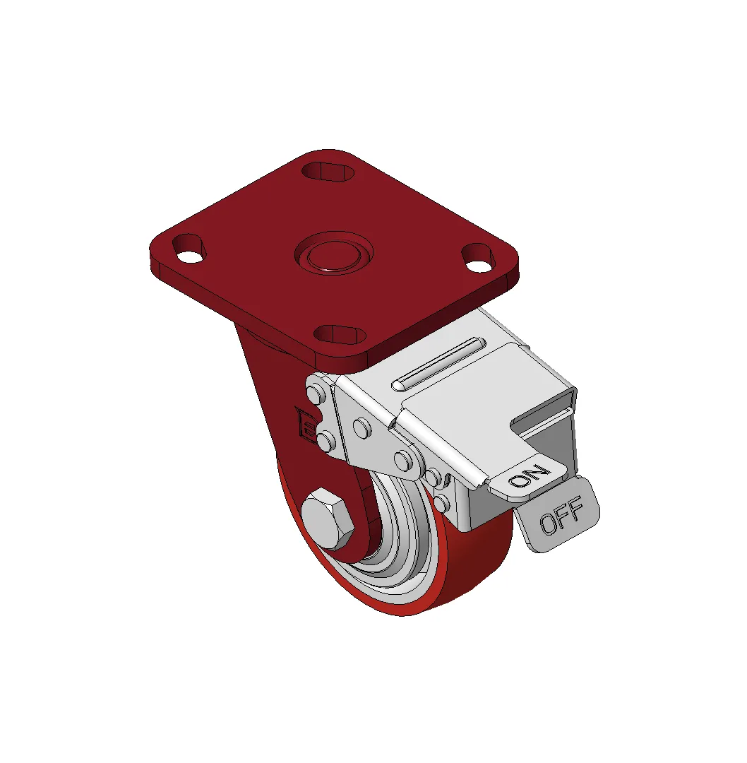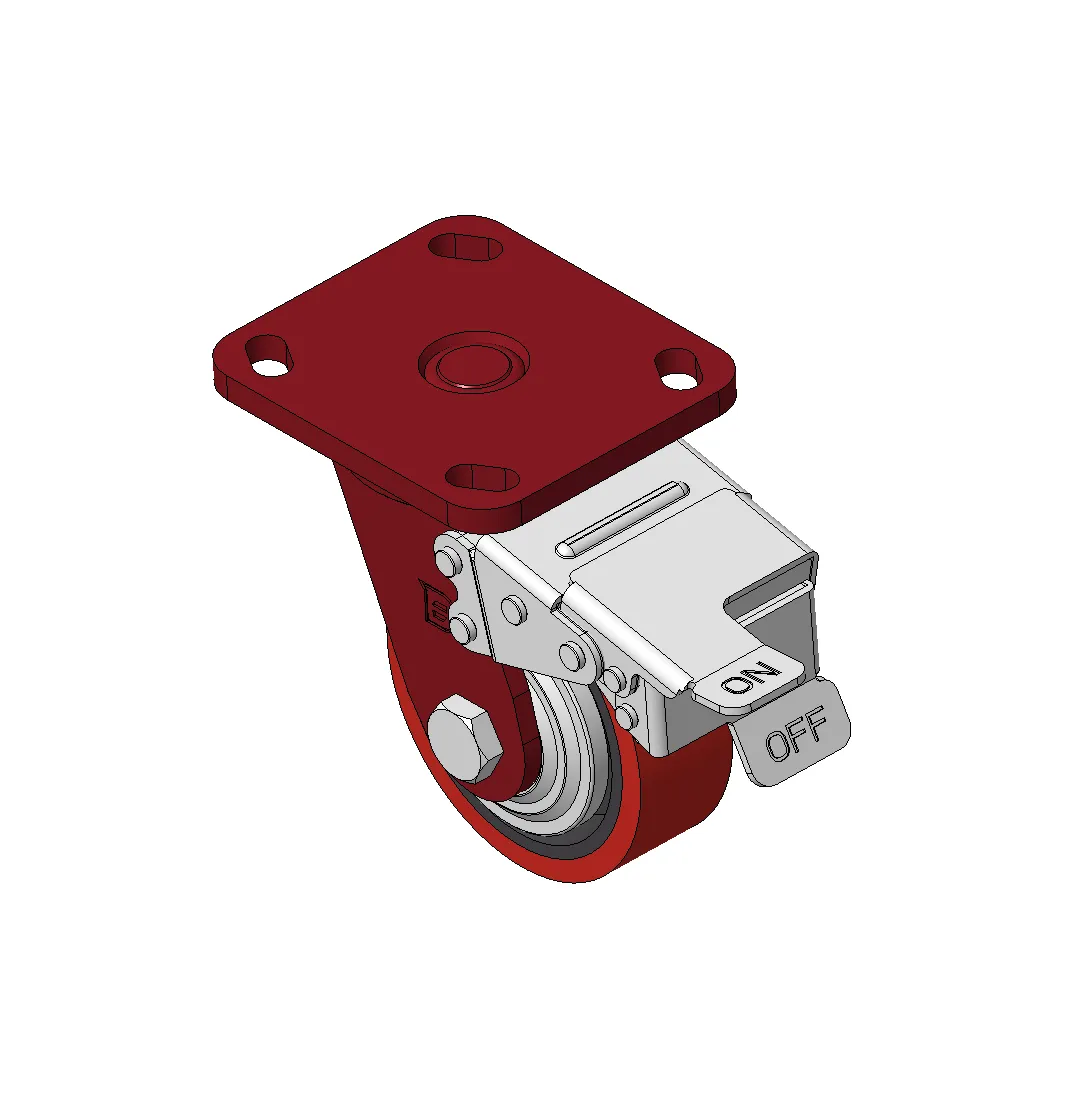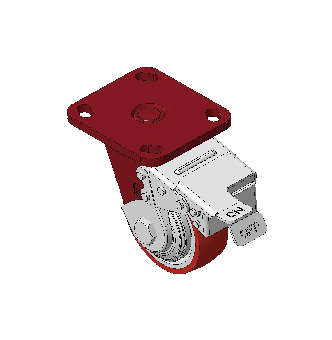 Bánh xe có hệ thống phanh và khóa bánh trước, khung thép hàn Sơn đỏ, lắp đế, khoảng cách lỗ 85x70 Lõi bánh xe bằng gang, gai polyurethane chất lượng cao, phay màu đỏ Ổ bi bánh xe—ổ bi chính xác với nắp bánh xe chống quấn đặc biệt