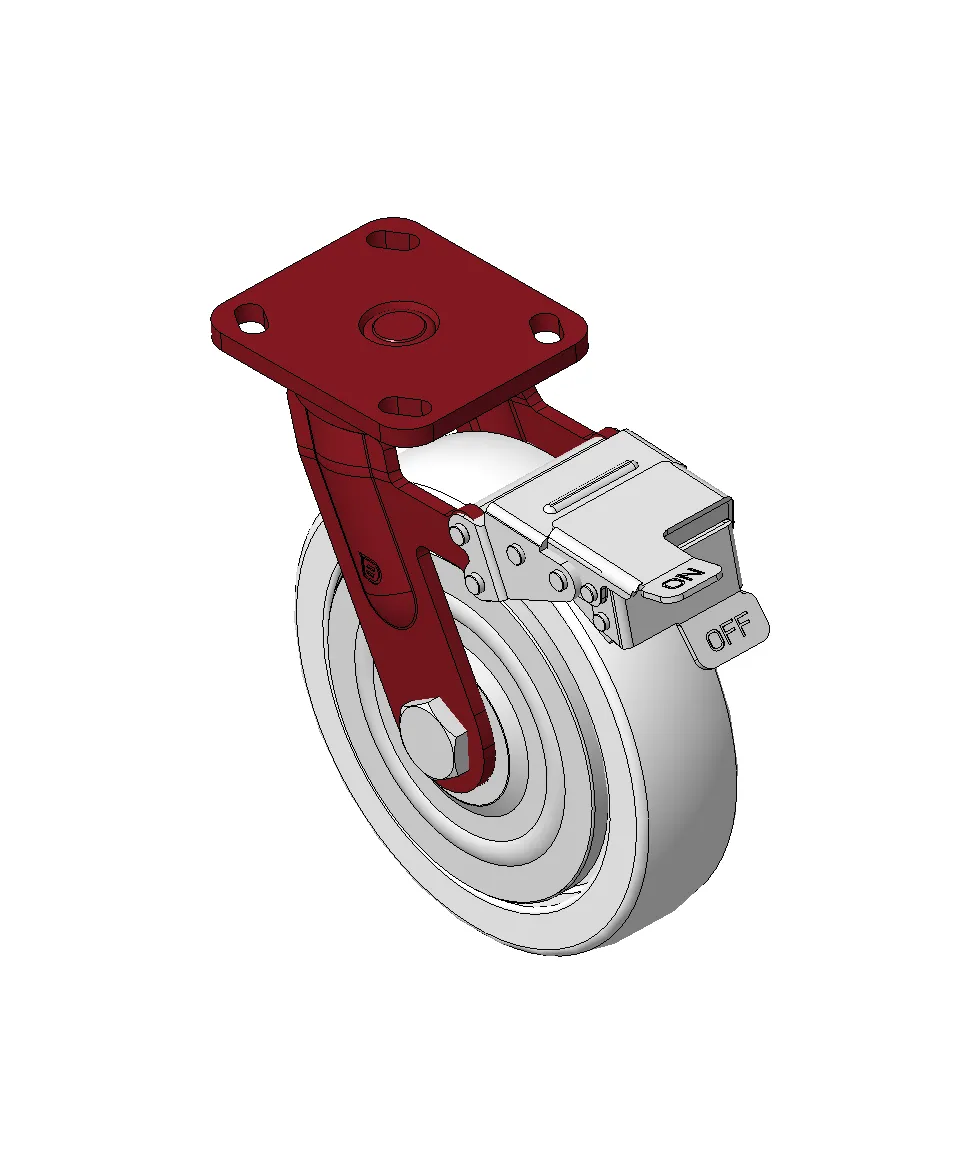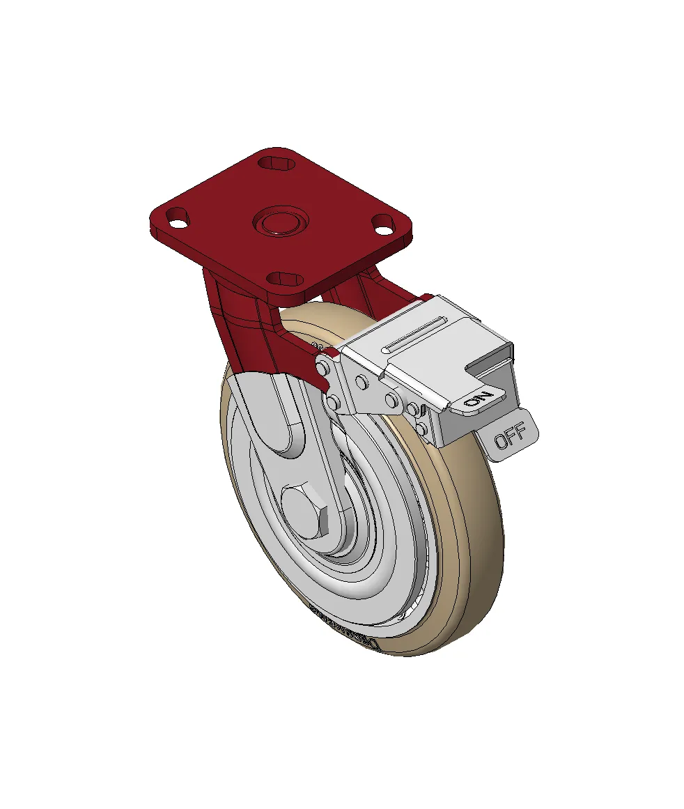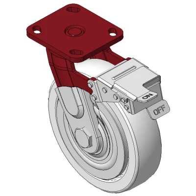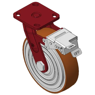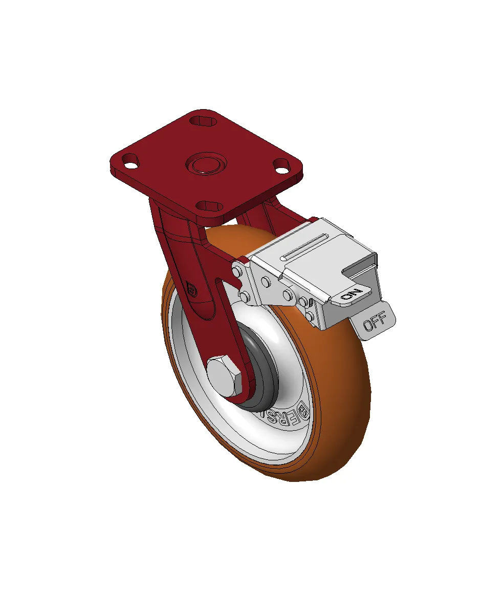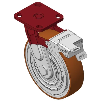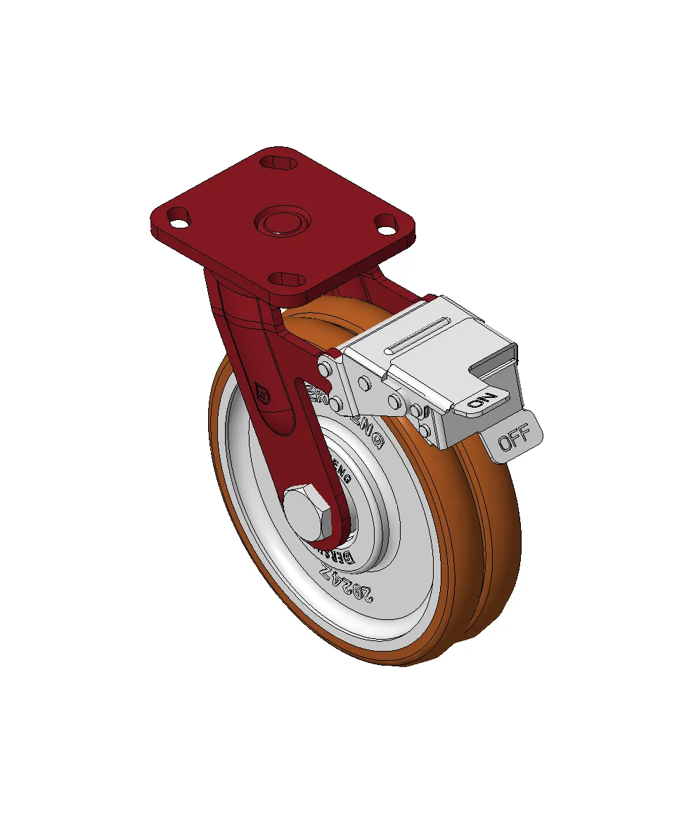 Bánh xe có phanh trước và hệ thống khóa, khung thép hàn Sơn đỏ, lắp đế, khoảng cách lỗ 85x70 Lõi gang, gai polyurethane chất lượng cao, phay màu nâu Vòng bi bánh xe—vòng bi chính xác với nắp chống quấn đặc biệt