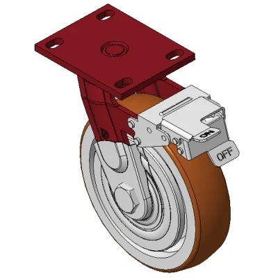 Bánh xe có phanh trước và hệ thống khóa, khung thép hàn Sơn đỏ, lắp đế, khoảng cách lỗ 85x70 Lõi bánh xe bằng gang, gai polyurethane chất lượng cao, phay màu đỏ Vòng bi bánh xe – vòng bi cầu chính xác