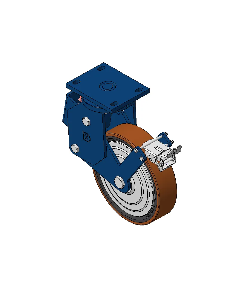 Bánh xe lò xo có phanh sau, khung thép hàn Hoàn thiện sơn xanh, lắp đế, khoảng cách lỗ 140x85 Lõi gang với gai polyurethane chất lượng cao Vòng bi bánh xe phay đỏ—vòng bi chính xác