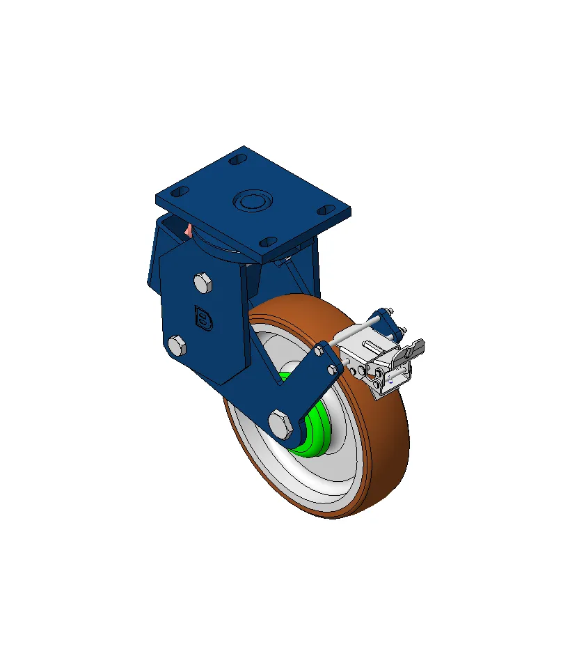 Bánh xe lò xo có phanh sau, khung thép hàn Sơn phủ màu xanh, lắp đế, khoảng cách lỗ 140x85 Lõi gang, mặt lốp polyurethane chất lượng cao Vòng bi bánh xe màu nâu phay – vòng bi bi chính xác