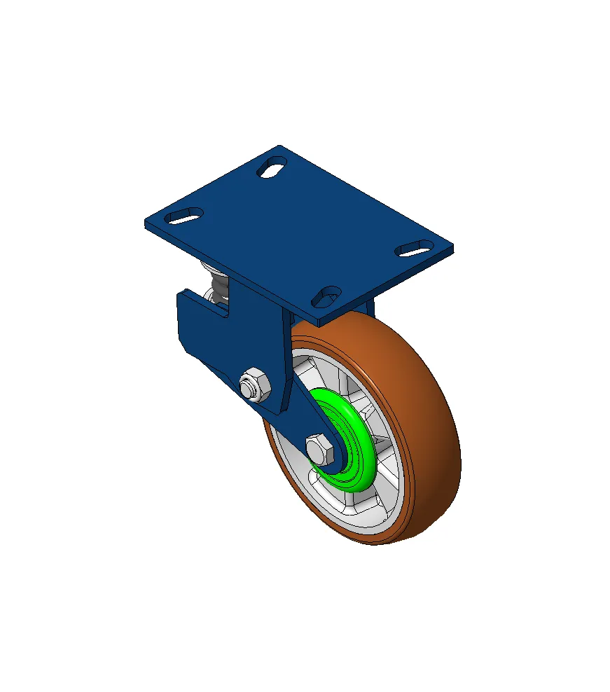 Bánh xe cố định, lò xo với khung thép hàn Hoàn thiện sơn màu xanh, lắp đế, khoảng cách lỗ 110x75 Lõi bánh xe bằng gang với gai polyurethane chất lượng cao, màu nâu phay Vòng bi bánh xe—vòng bi cầu chính xác