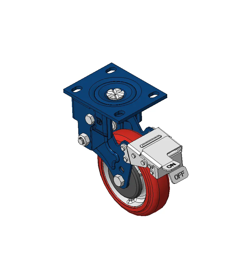 Bánh xe lò xo có phanh trước, khung thép hàn Hoàn thiện sơn xanh, lắp đế, khoảng cách lỗ 105 x 78,5 Lõi gang, mặt lốp polyurethane chất lượng cao Hoàn thiện phay đỏ, vòng bi chính xác