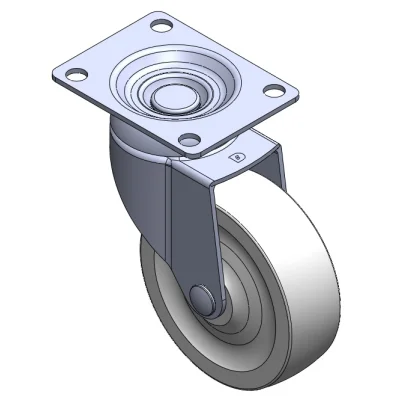 Bánh xe xoay, đế được tán đinh và dập, ren 5/8"-11. Rung bề mặt, lắp đế. Lõi và mặt đế bằng nhựa nhiệt dẻo. Màu xám. Vòng bi bánh xe—vòng bi chính xác.