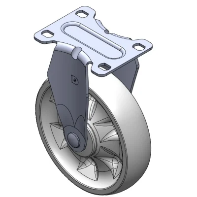 Bánh xe cố định, khung dập liền khối; chống rung bề mặt, thiết bị lắp tấm đế; lõi bánh xe bằng polypropylen gia cố chống va đập, bề mặt bánh xe bằng chất đàn hồi nhiệt dẻo (TPR); màu xám, ổ trục bánh xe—ổ trục bi chính xác.