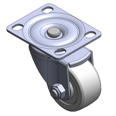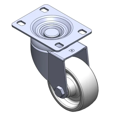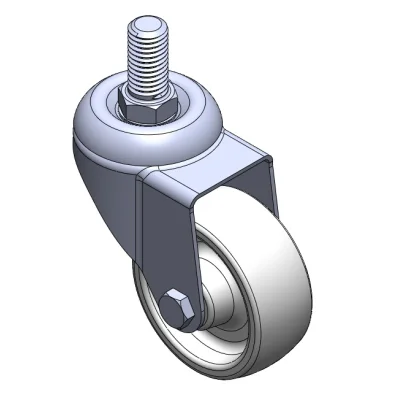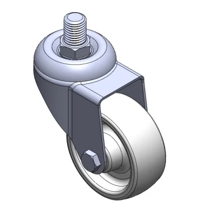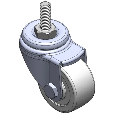 Bánh xe di động, chân đế ren dập khuôn—M16xP2.0 Rung bề mặt, thiết bị lắp đặt ren Lõi và vành bánh xe bằng nhựa nhiệt dẻo Bánh xe màu trắng, có ống trung tâm.