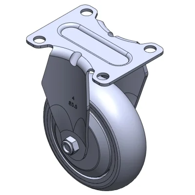 固定式腳輪,一體成型沖壓腳架 —高級孔 表面振動,底板式安裝裝置 耐衝擊聚丙烯輪芯,熱塑性彈性體(TPR)輪面 灰色,輪子軸承—精密滾珠。