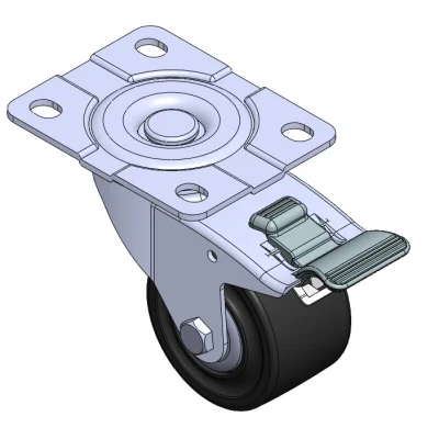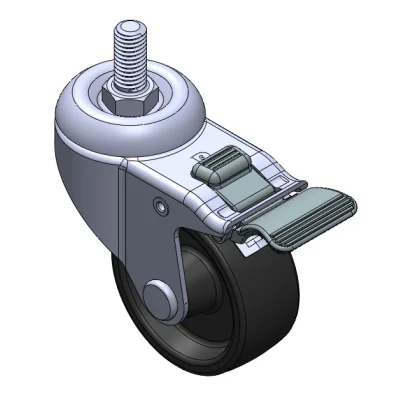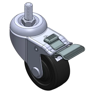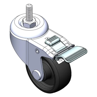 配有雙煞式,鎖定系統的腳輪。牙心鉚合沖壓腳架—3/8"-16牙 表面振動,底板式安裝裝置 熱可塑性塑料輪芯、輪面 黑色,輪子—中管式。