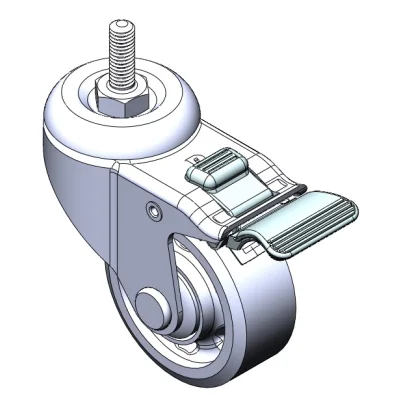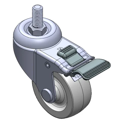 配有雙煞式,鎖定系統的腳輪。牙心鉚合沖壓腳架—1/2"-12牙 表面振動,底板式安裝裝置 熱可塑性塑料輪芯、輪面 白色,輪子—中管式。