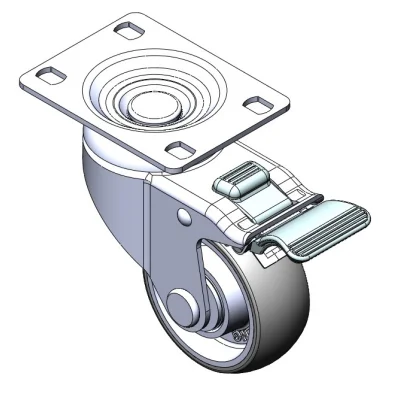 配有雙煞式,鎖定系統的腳輪。牙心鉚合沖壓腳架—3/8"-16牙 表面振動,底板式安裝裝置 加強式耐衝擊聚丙烯輪芯,熱塑性彈性體(TPR)輪面 灰色,輪子軸承—精密滾珠。