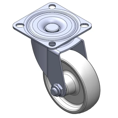 活動式腳輪,底板鉚合沖壓腳架 表面振動,底板式安裝裝置 熱可塑性塑料輪芯、輪面 白色,輪子—中管式。