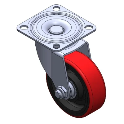 活動式腳輪,底板鉚合沖壓腳架 表面振動,底板式安裝裝置 鑄鐵製輪芯,高品質聚氨酯輪面 紅色,輪子軸承—精密滾珠。