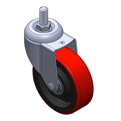 活動式腳輪,牙心鉚合沖壓腳架—1/2"-12牙 表面振動,絲扣式安裝裝置 鑄鐵製輪芯,高品質聚氨酯輪面 紅色,輪子軸承—精密滾珠。
