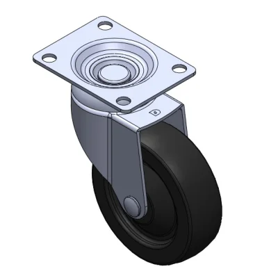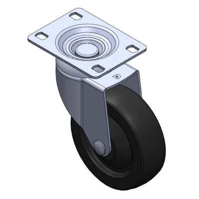 活動式腳輪,底板鉚合沖壓腳架—高級孔 表面振動,底板式安裝裝置 高品質的彈力橡膠輪芯,輪面 黑色,輪子—中管式。