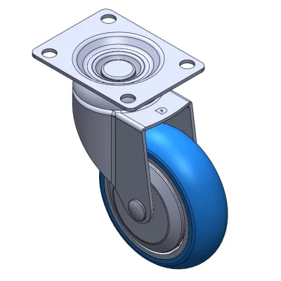 活動式腳輪,底板鉚合沖壓腳架—儀器孔 表面振動,底板式安裝裝置 鋁製輪芯,高品質聚氨酯輪面 藍色,輪子軸承—精密滾珠。