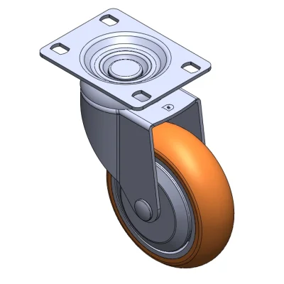活動式腳輪,底板鉚合沖壓腳架—高級孔 表面振動,底板式安裝裝置 鋁製輪芯,高品質聚氨酯輪面 褐色,輪子軸承—精密滾珠。