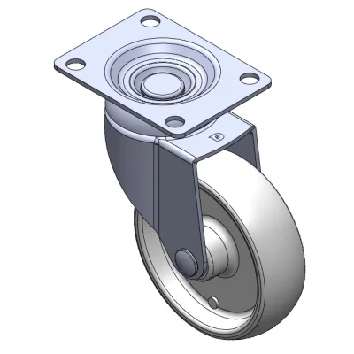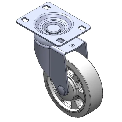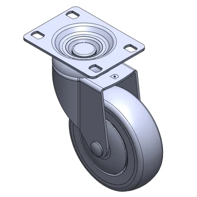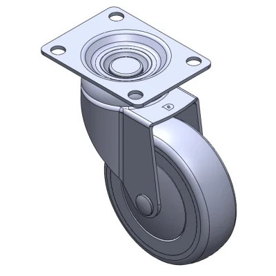 活動式腳輪,底板鉚合沖壓腳架—高級孔 表面振動,底板式安裝裝置 耐衝擊聚丙烯輪芯,熱塑性彈性體(TPR)輪面 灰色,輪子軸承—精密滾珠。