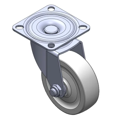活動式腳輪,底板鉚合沖壓腳架—高級孔 表面振動,底板式安裝裝置 加強型熱可塑性塑料輪芯、輪面 白色,輪子軸承—精密滾珠。