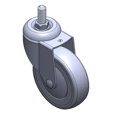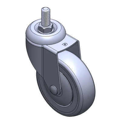 活動式腳輪,牙心鉚合沖壓腳架—1/2"-12牙 表面振動,絲扣式安裝裝置 耐衝擊聚丙烯輪芯,熱塑性彈性體(TPR)輪面 灰色,輪子軸承—精密滾珠。
