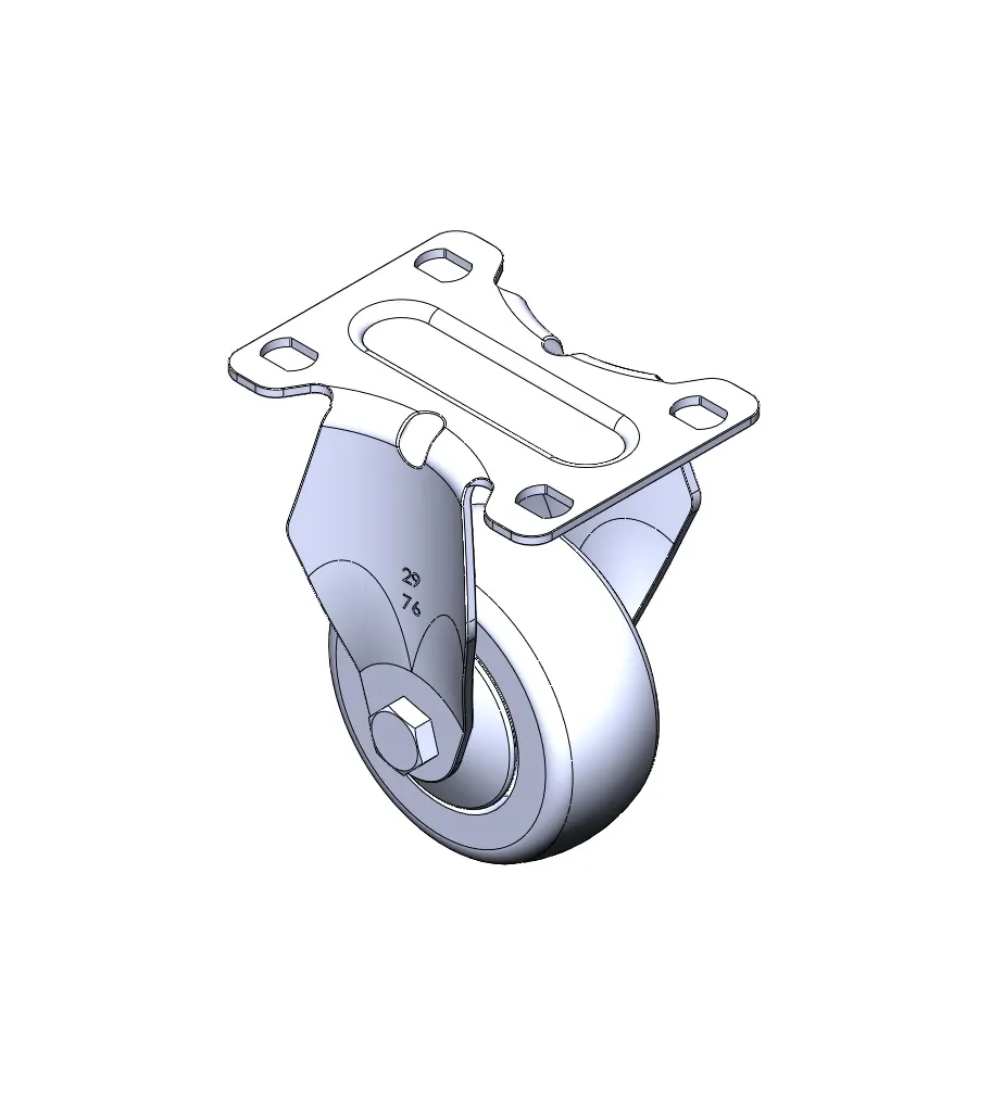 固定式腳輪,一體成型沖壓腳架—高級孔 表面鍍鋅,底板式安裝裝置 加強式耐衝擊聚丙烯輪芯,熱塑性彈性體(TPR)輪面 深灰色,輪子軸承—精密滾珠。