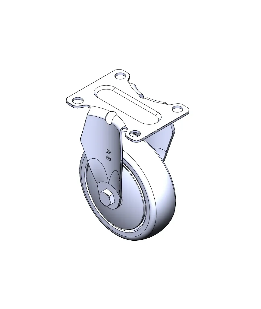 固定式腳輪,一體成型沖壓腳架—斜孔 表面鍍鋅,底板式安裝裝置 耐衝擊聚丙烯輪芯,熱塑性彈性體(TPR)輪面 深灰色,輪子—中管式。