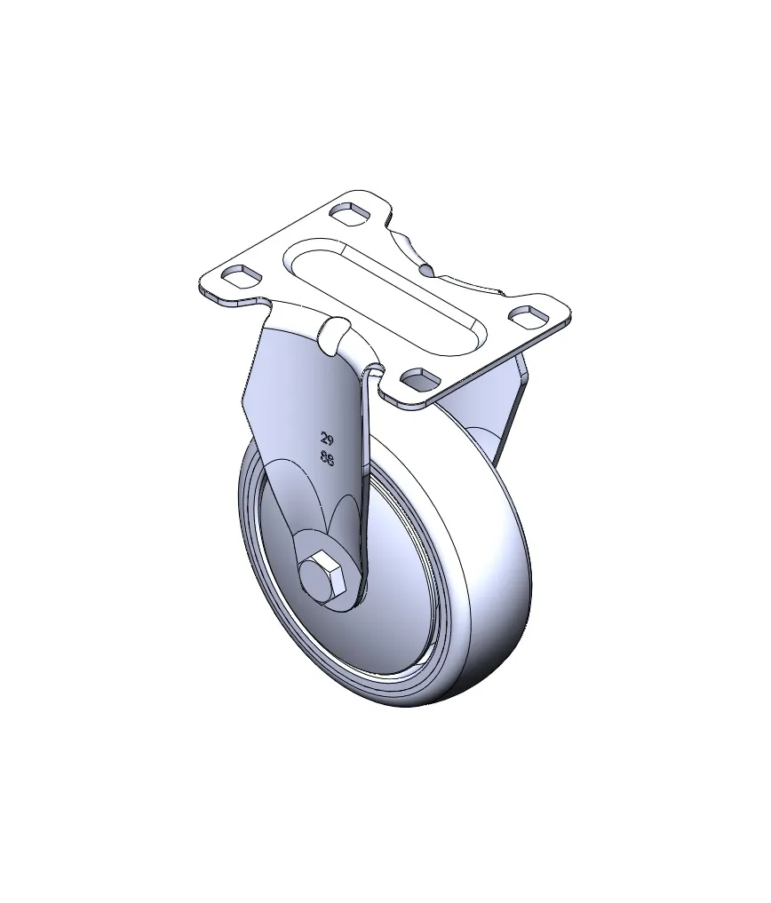 固定式腳輪,一體成型沖壓腳架—高級孔 表面鍍鋅,底板式安裝裝置 耐衝擊聚丙烯輪芯,熱塑性彈性體(TPR)輪面 深灰色,輪子軸承—精密滾珠。