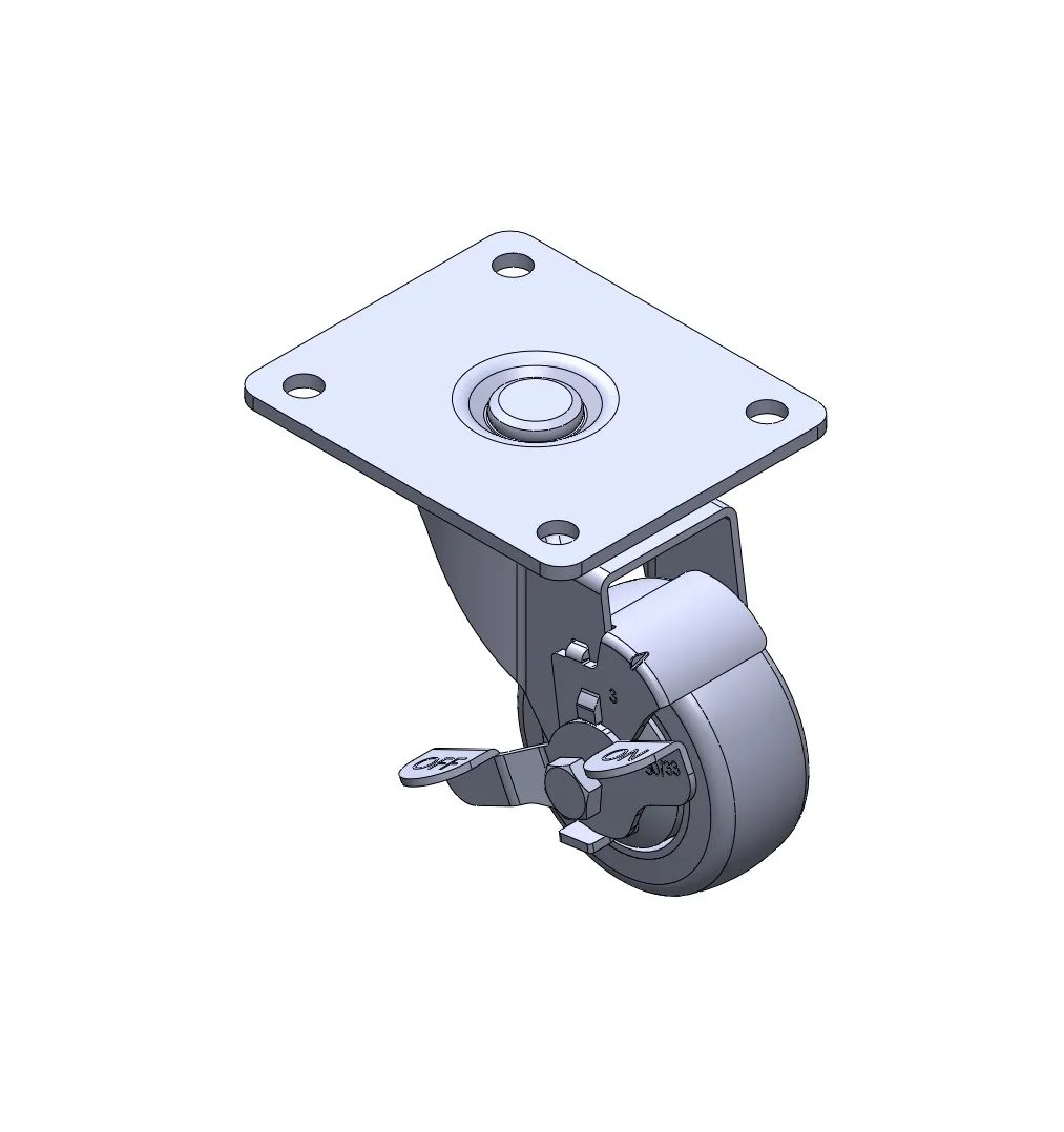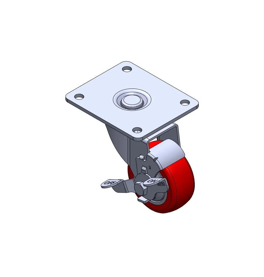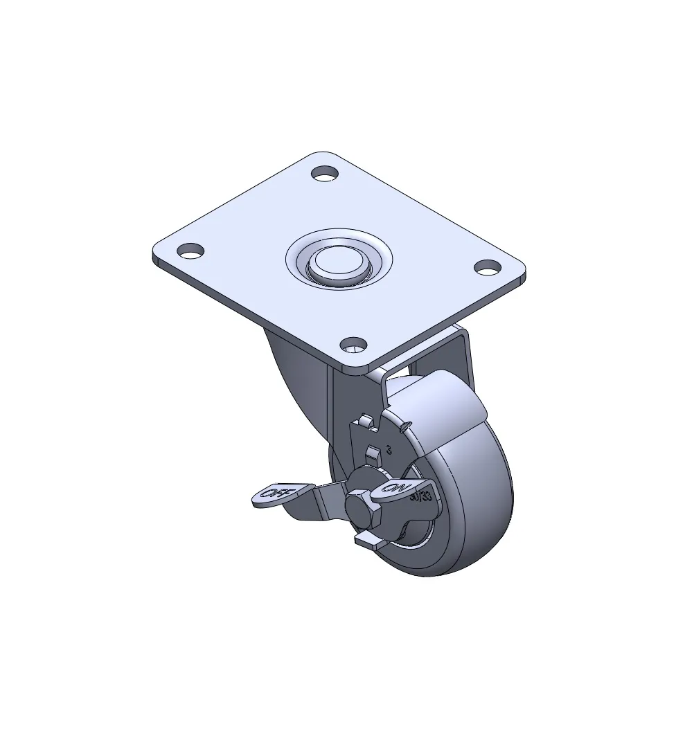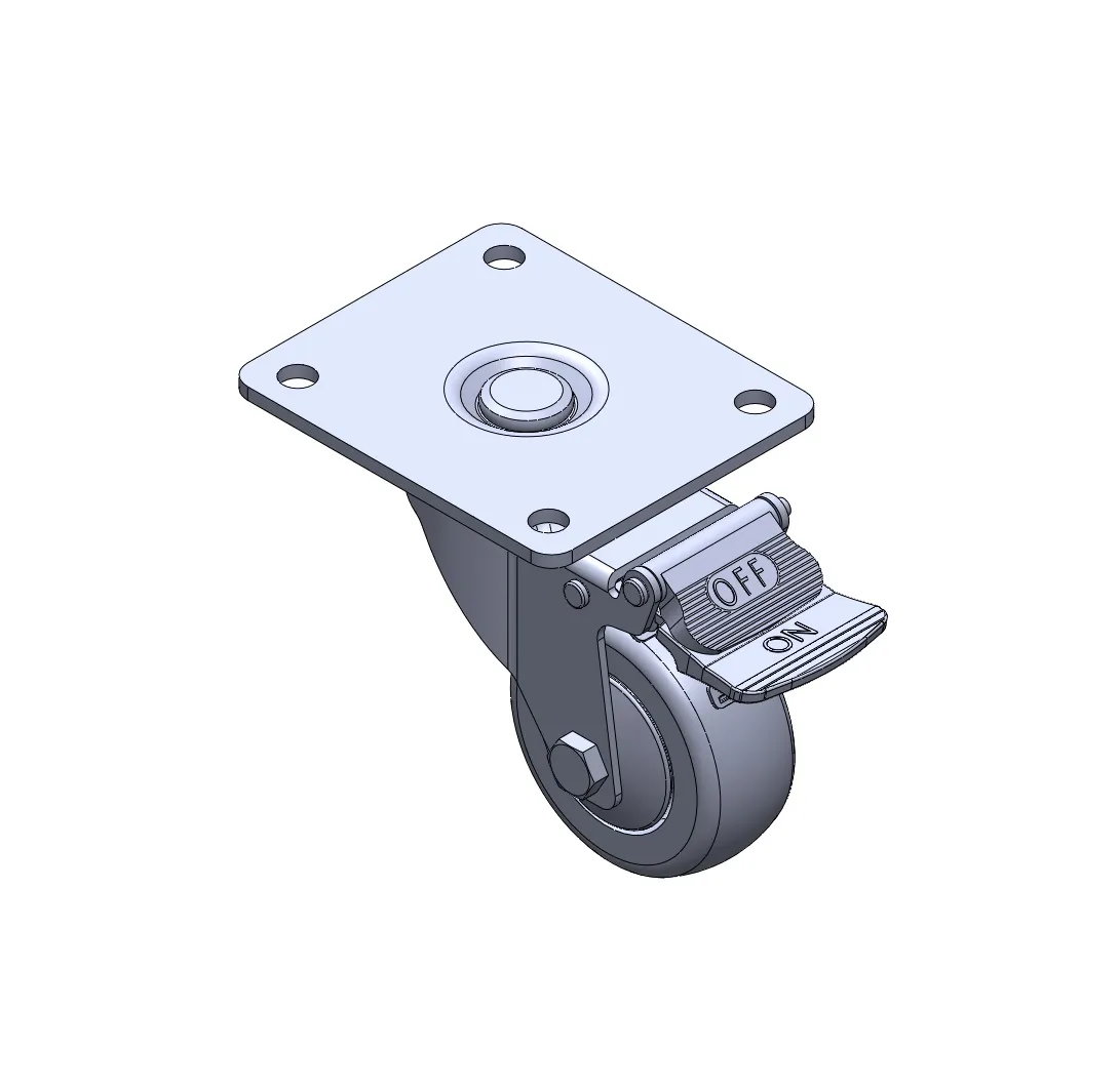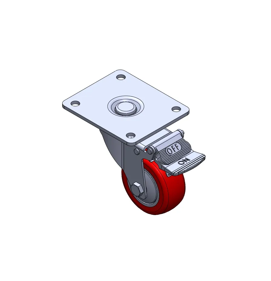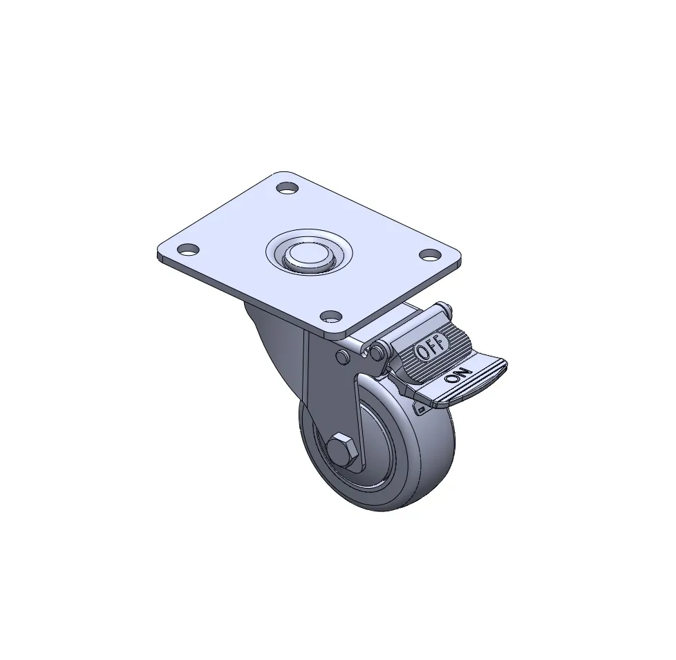 配有雙煞式,鎖定系統的腳輪。底板鉚合沖壓腳架—圓孔 表面電鍍,底板式(4T)安裝裝置 耐衝擊聚丙烯輪芯,熱塑性彈性體(TPR)輪面 深灰色,輪子軸承—精密滾珠。