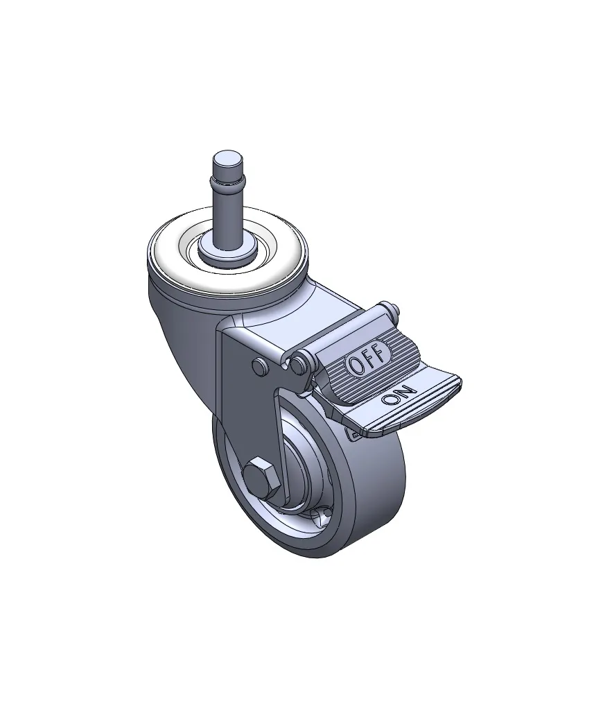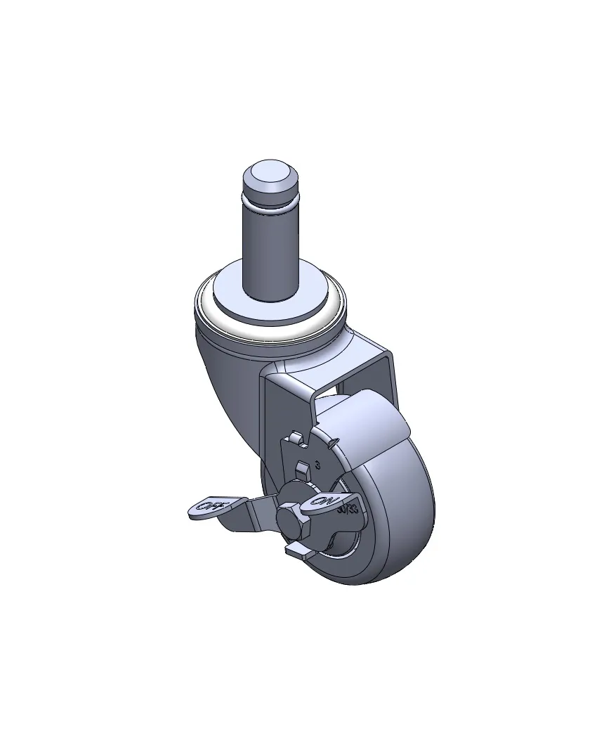 配有側(輪)煞式,鎖定系統的腳輪。插心鉚合沖壓腳架— Ø22x56L 表面鍍鋅,插心式安裝裝置,附扣環 耐衝擊聚丙烯輪芯,熱塑性彈性體(TPR)輪面 深灰色,輪子軸承—精密滾珠。