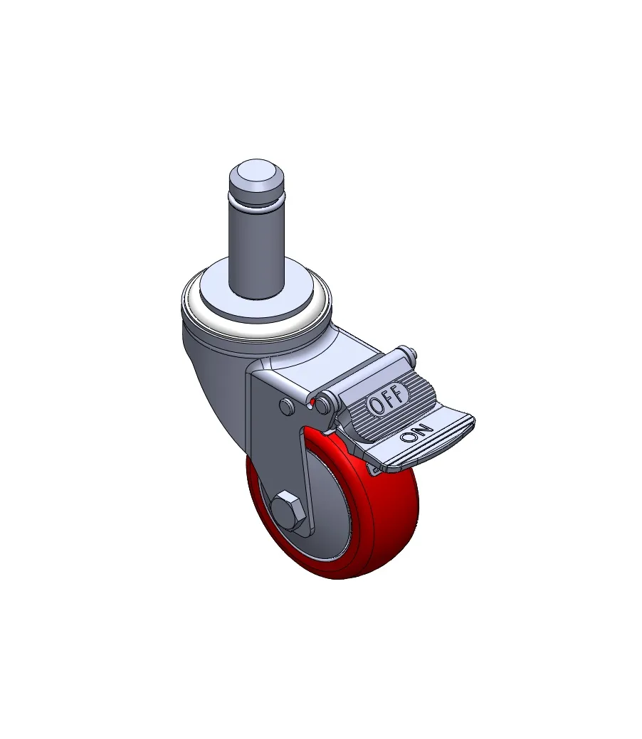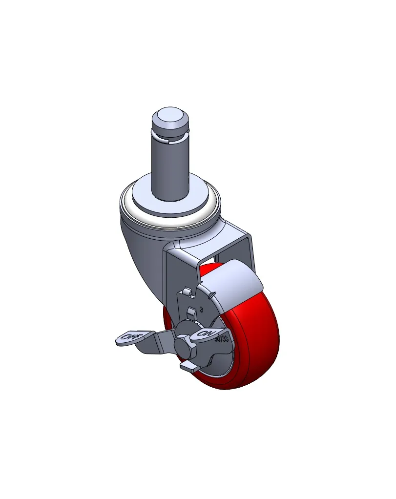 配有側(輪)煞式,鎖定系統的腳輪。插心鉚合沖壓腳架— Ø22x56L 表面鍍鋅,插心式安裝裝置,附扣環 耐衝擊聚丙烯輪芯,熱塑性彈性體(TPR)輪面 紅色,輪子軸承—精密滾珠。