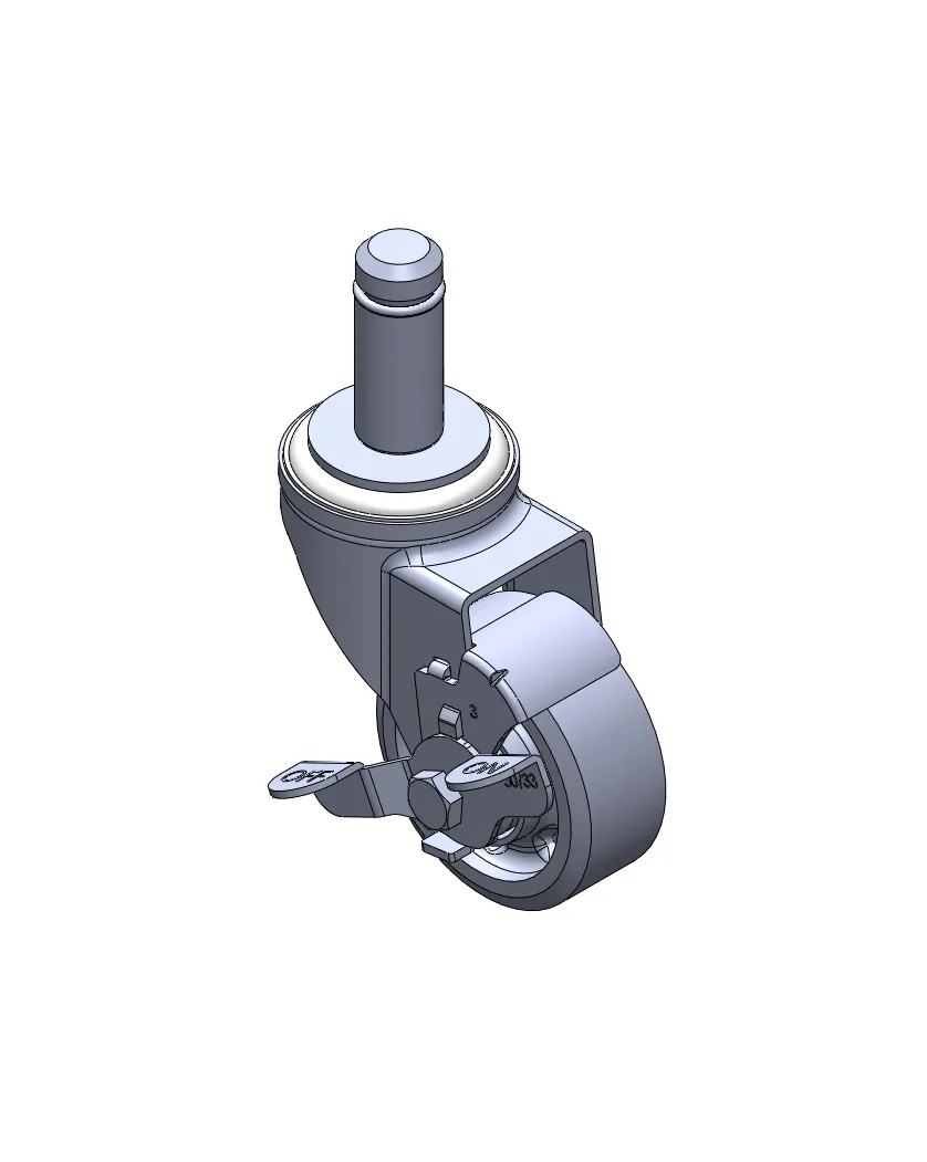 配有雙煞式,鎖定系統的腳輪。插心鉚合沖壓腳架— Ø22x56L 表面鍍鋅,插心式安裝裝置,附扣環 耐衝擊聚丙烯輪芯,熱塑性彈性體(TPR)輪面 深灰色,輪子軸承—精密滾珠。