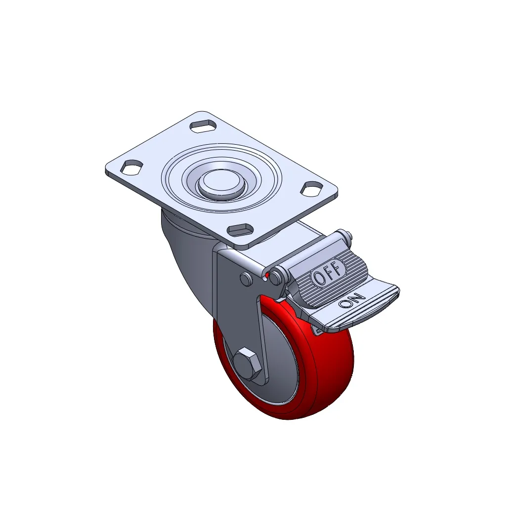 配有側(輪)煞式,鎖定系統的腳輪。底板鉚合沖壓腳架—斜孔 表面電鍍,底板式(3T)安裝裝置 耐衝擊聚丙烯輪芯,熱塑性彈性體(TPR)輪面 紅色,輪子軸承—精密滾珠。