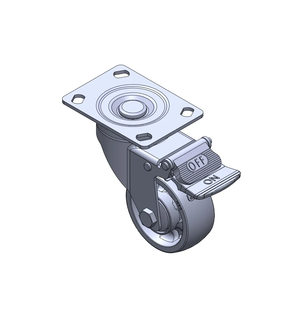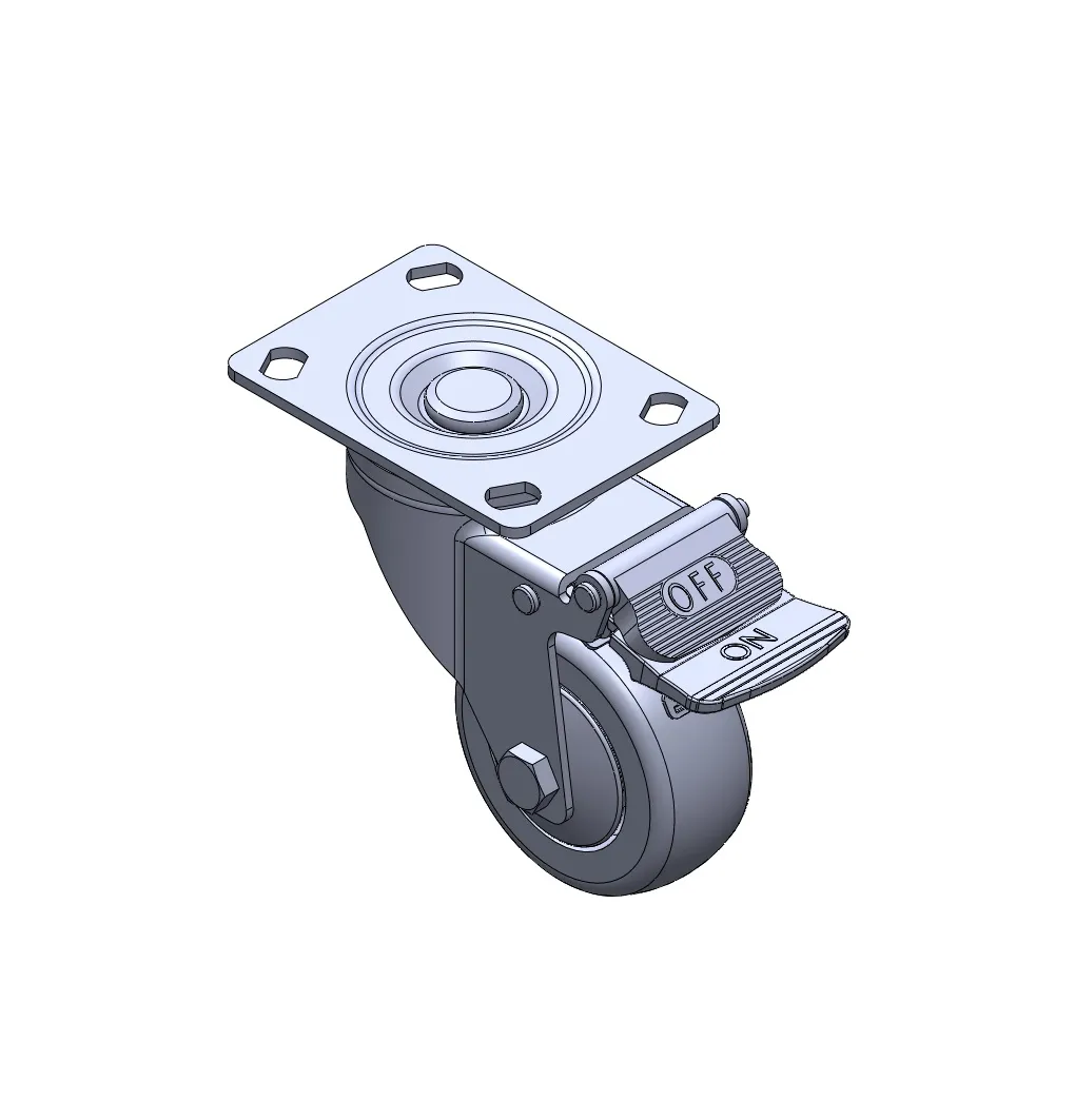 配有雙煞式,鎖定系統的腳輪。底板鉚合沖壓腳架—高級孔 表面電鍍,底板式安裝裝置 加強型熱可塑性塑膠輪芯、輪面 輪子軸承—精密滾珠。