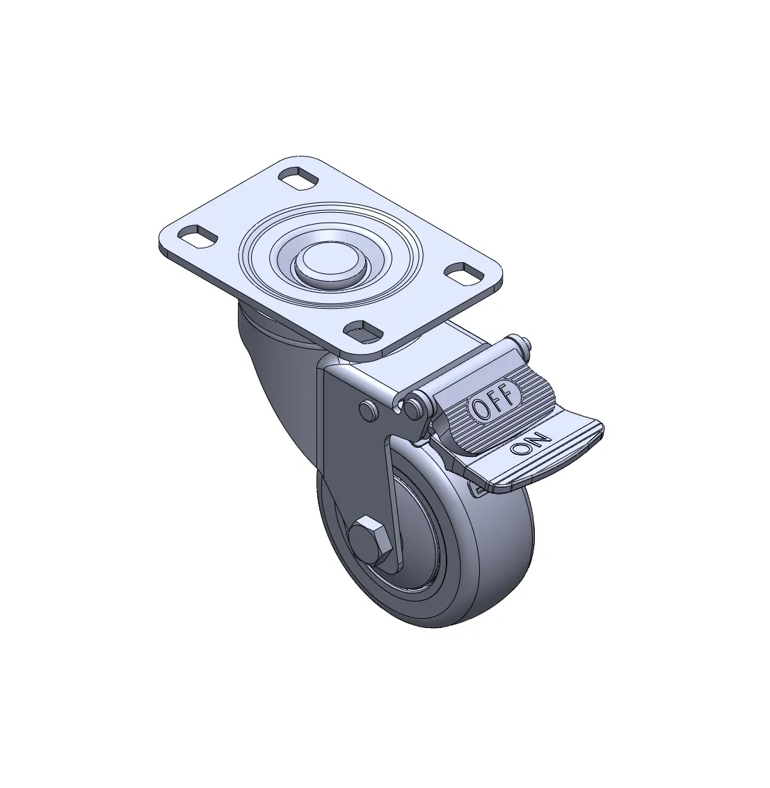 配有雙煞式,鎖定系統的腳輪。底板鉚合沖壓腳架—高級孔 表面電鍍,底板式(3T)安裝裝置 耐衝擊聚丙烯輪芯,熱塑性彈性體(TPR)輪面 深灰色,輪子軸承—精密滾珠。