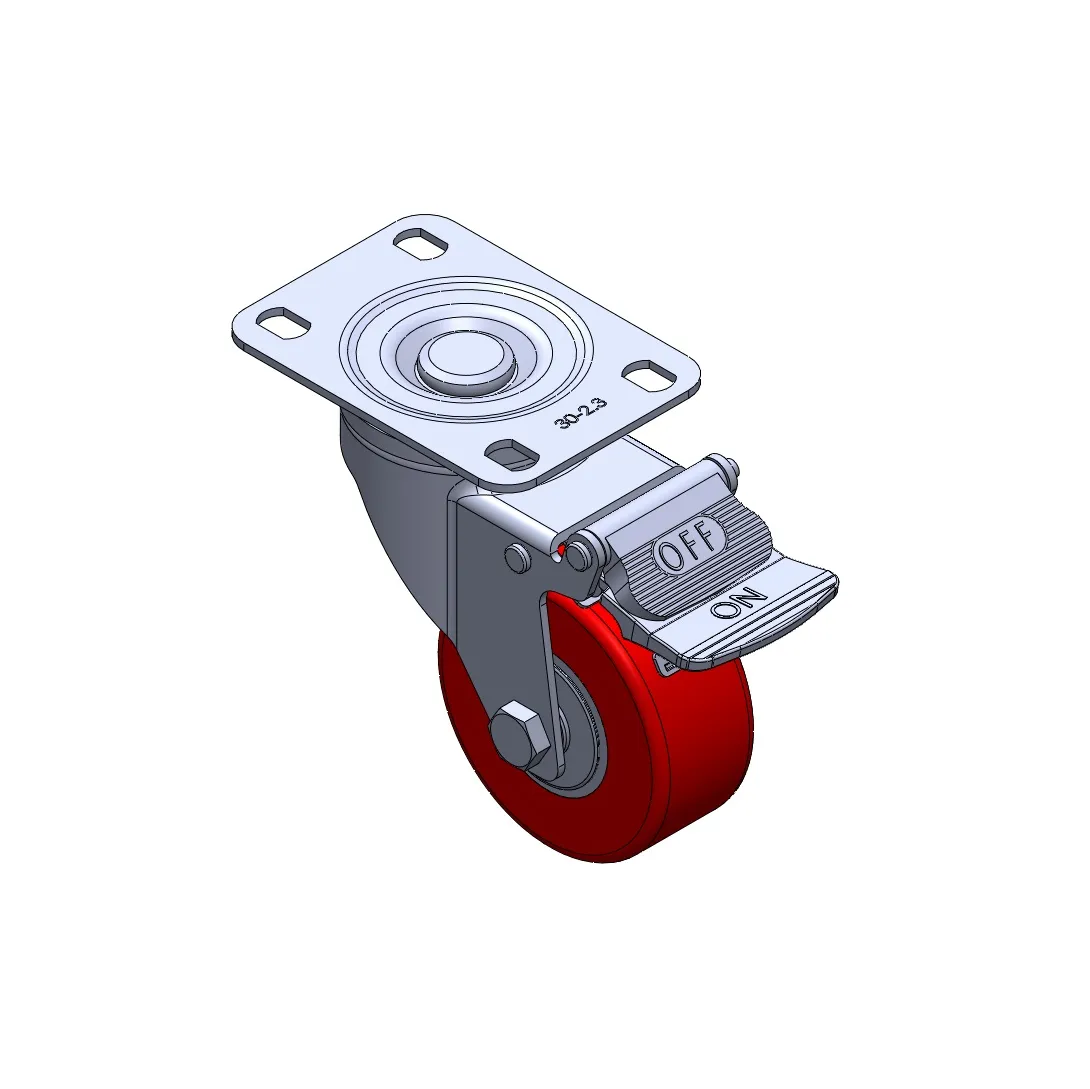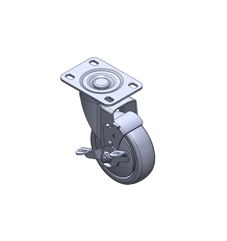 配有側(輪)煞式,鎖定係統的腳輪。底板鉚合沖壓腳架—高級孔 表面鍍鋅,底板式(3T)安裝裝置 耐衝擊聚丙烯輪芯,熱塑性彈性體(TPR)輪面 深灰色,輪子—中管式。
