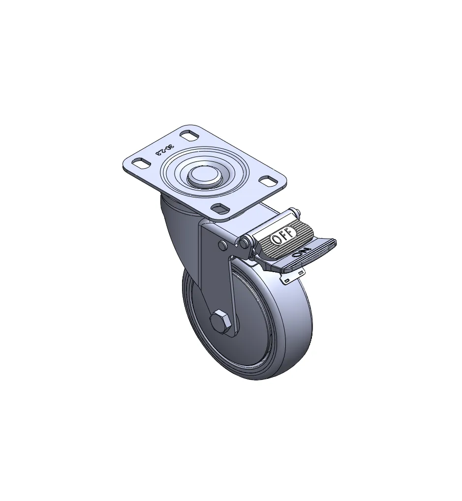 配有雙煞式,鎖定系統的腳輪。底板鉚合沖壓腳架—高級孔 表面鍍鋅,底板式安裝裝置 耐衝擊聚丙烯輪芯,熱塑性彈性體(TPR)輪面 深灰色,輪子軸承—精密滾珠。
