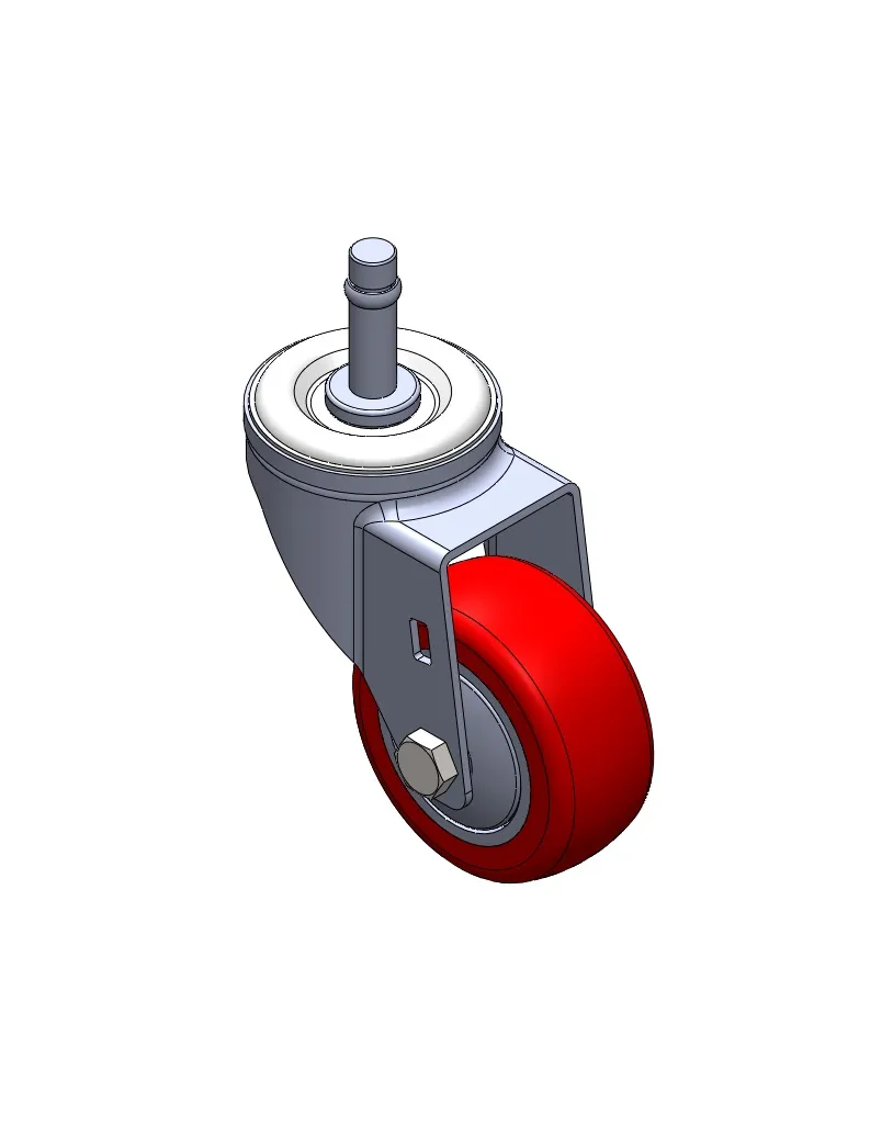 活動式腳輪,插心鉚合沖壓腳架—Ø11x38L 表面鍍鋅,插心式安裝裝置,附銅扣 耐衝擊聚丙烯輪芯,熱塑性彈性體(TPR)輪面 紅色,輪子軸承—精密滾珠。