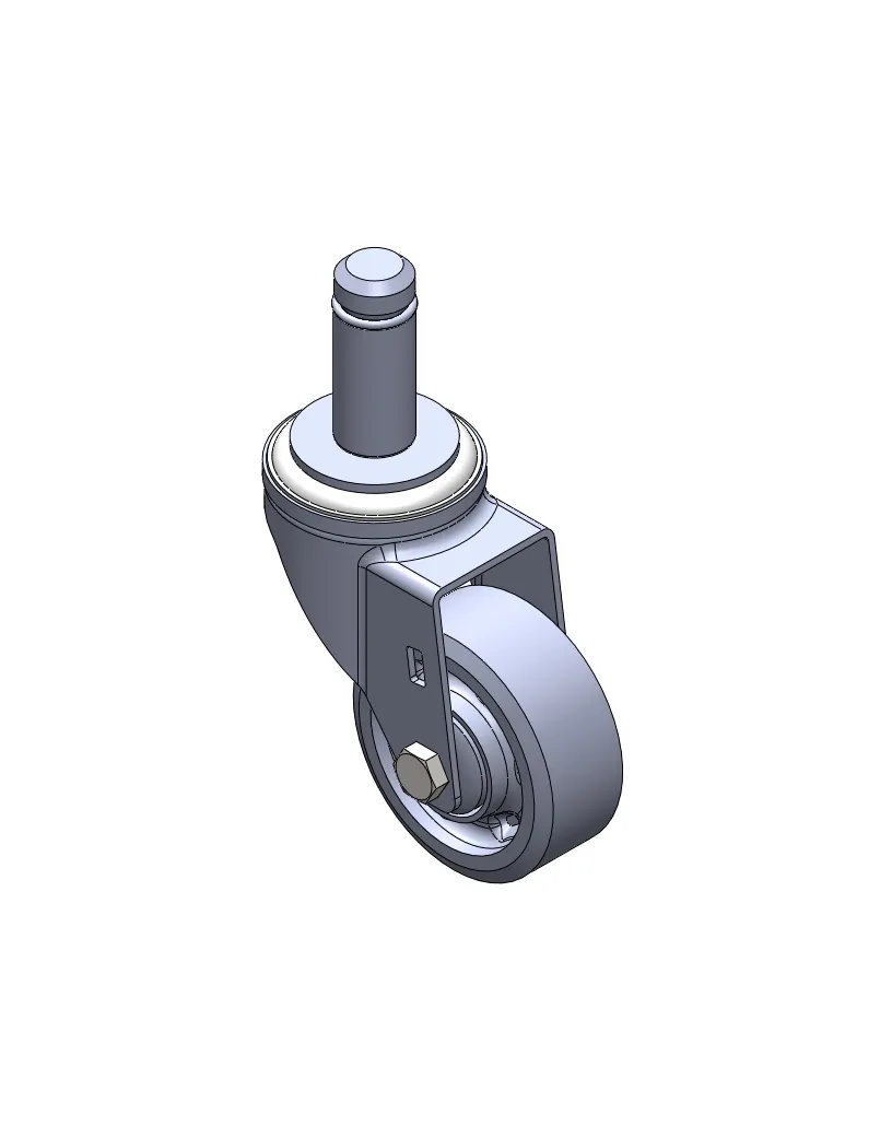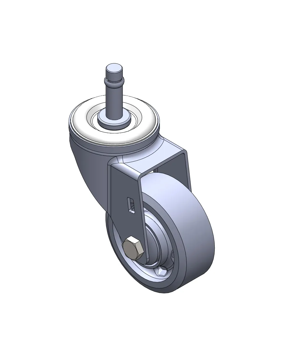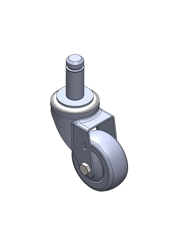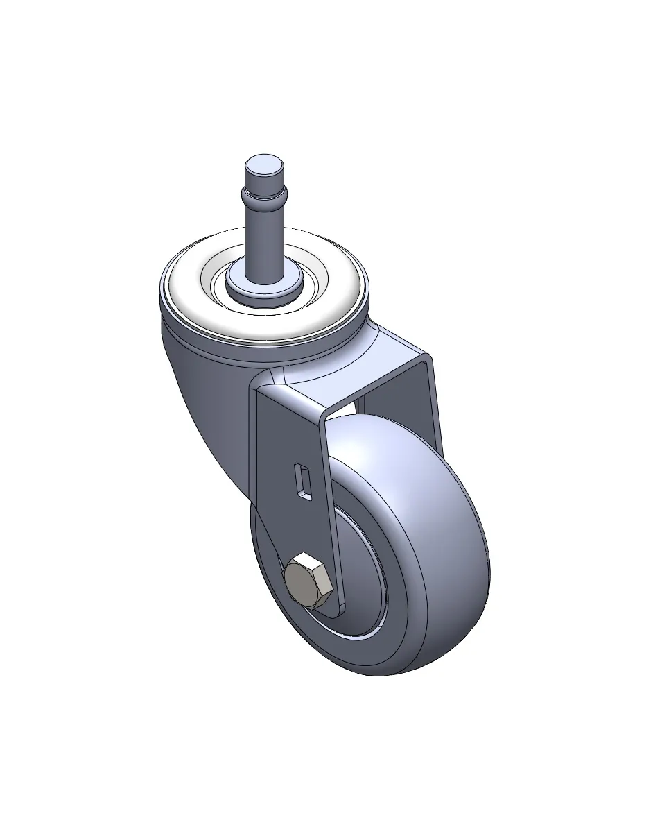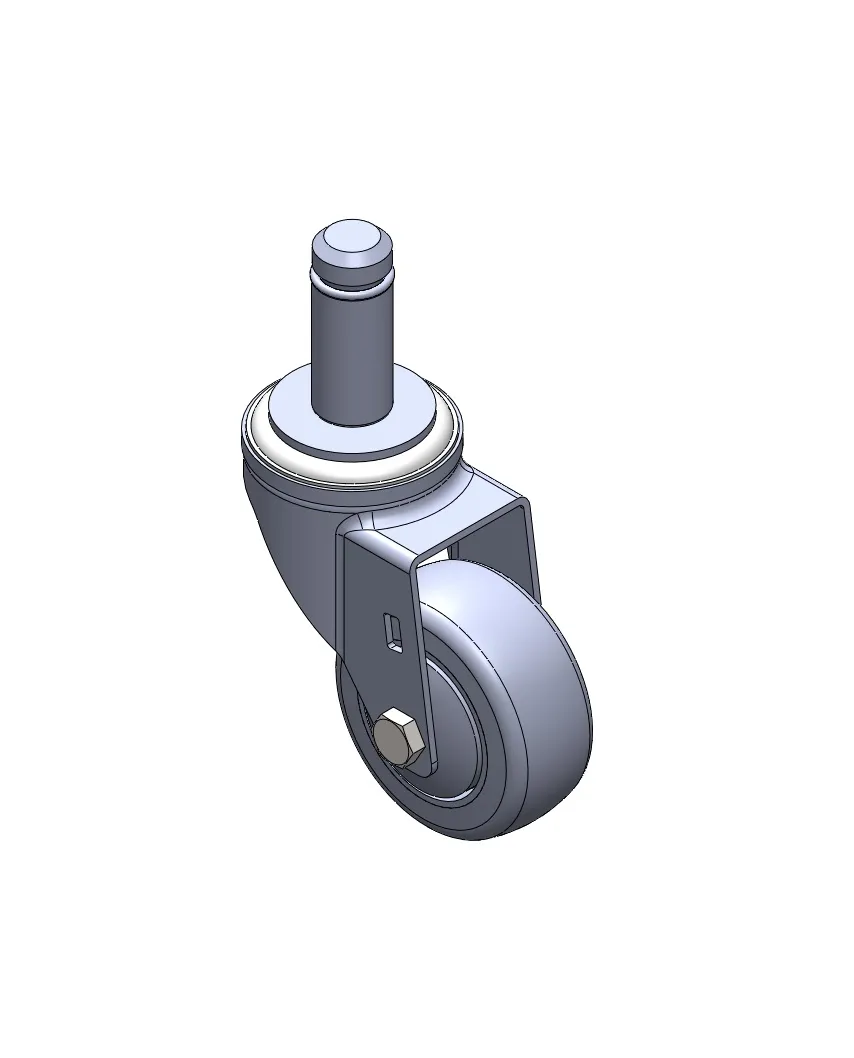 活動式腳輪,插心鉚合沖壓腳架—Ø22x56L附扣環 表面鍍鋅,插心式安裝裝置 耐衝擊聚丙烯輪芯,熱塑性彈性體(TPR)輪面 深灰色,輪子軸承—精密滾珠。