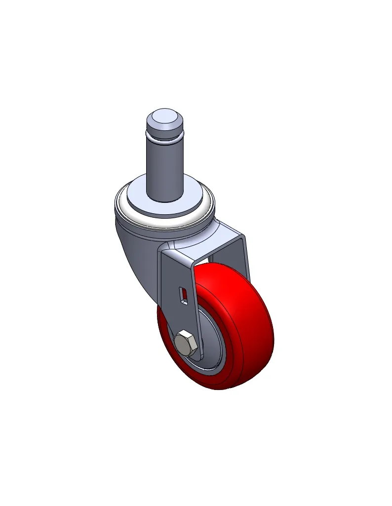 活動式腳輪,插心鉚合沖壓腳架—Ø22x56L附扣環 表面鍍鋅,插心式安裝裝置 耐衝擊聚丙烯輪芯,熱塑性彈性體(TPR)輪面 紅色,輪子軸承—精密滾珠。