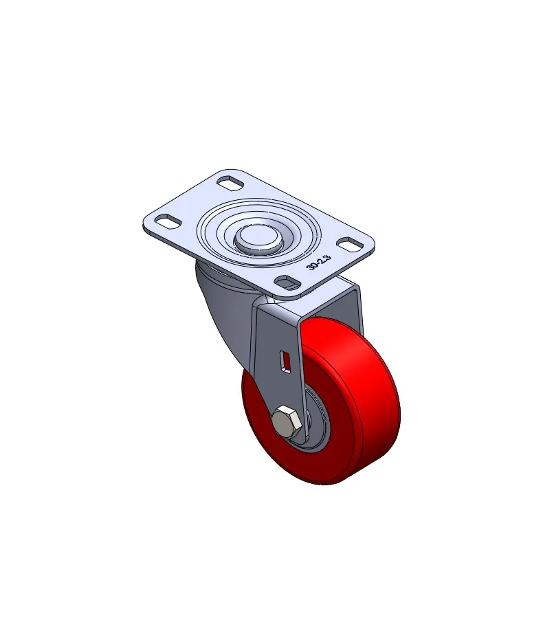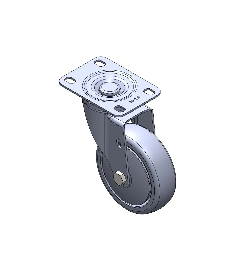 配有(180°)定向活動式腳輪。底板鉚合沖壓腳架—斜孔 表面鍍鋅,底板式(3T)安裝裝置 耐衝擊聚丙烯輪芯,熱塑性彈性體(TPR)輪面 深灰色,輪子軸承—精密滾珠。