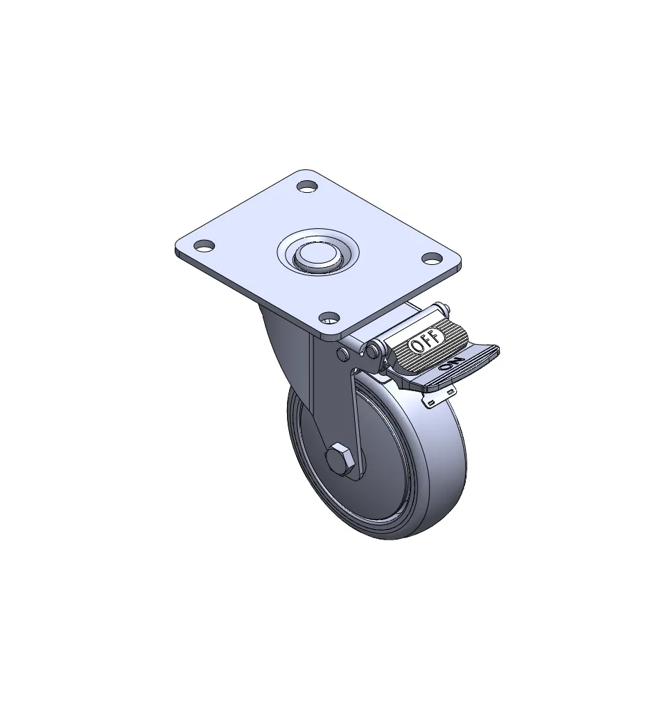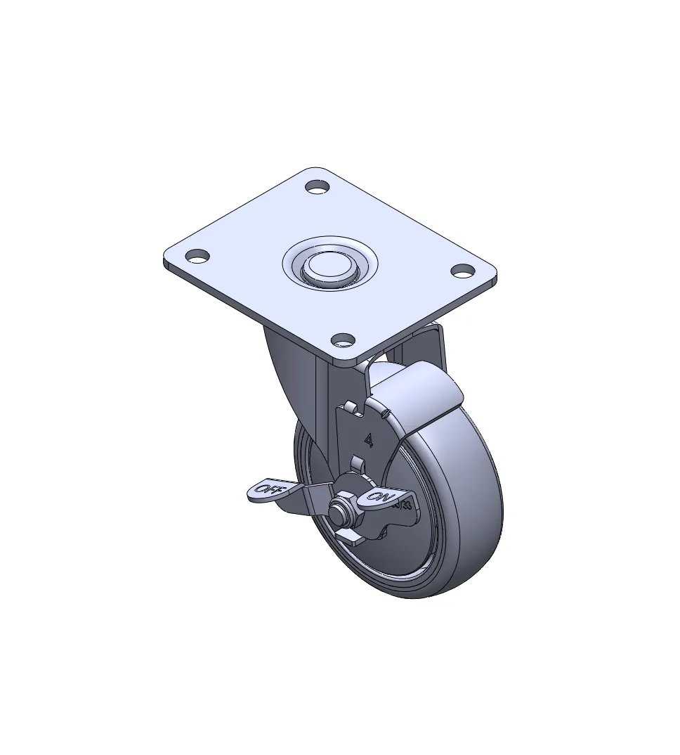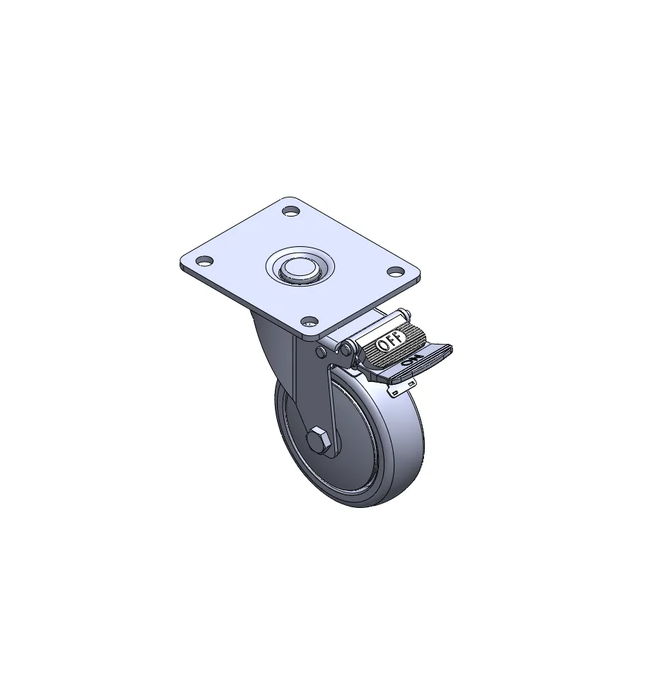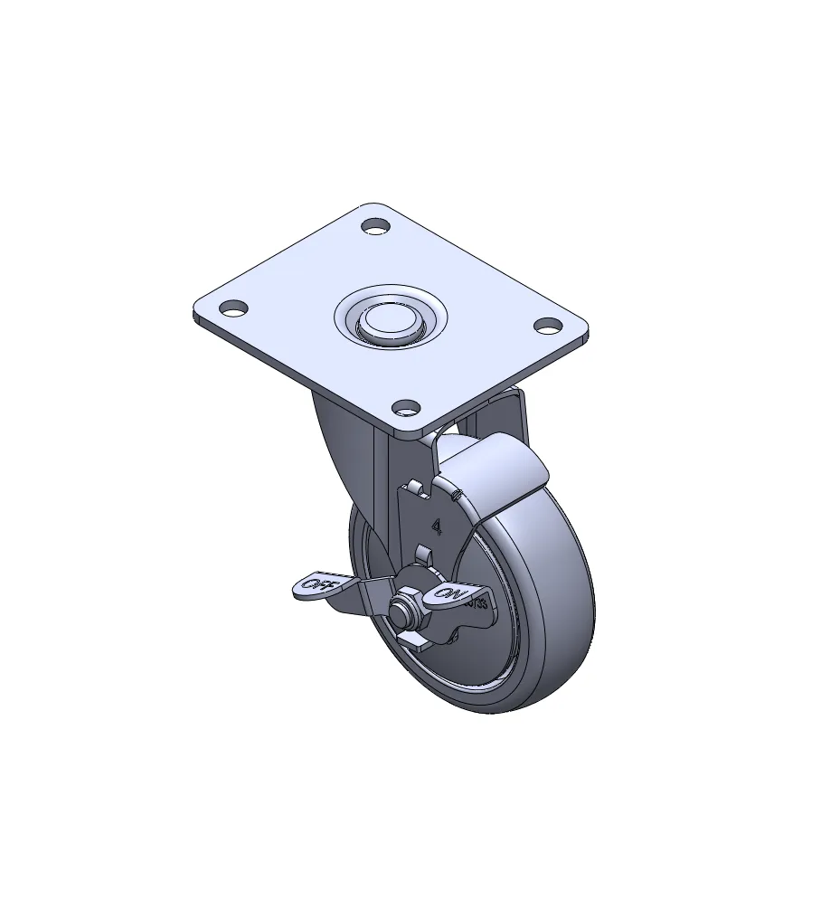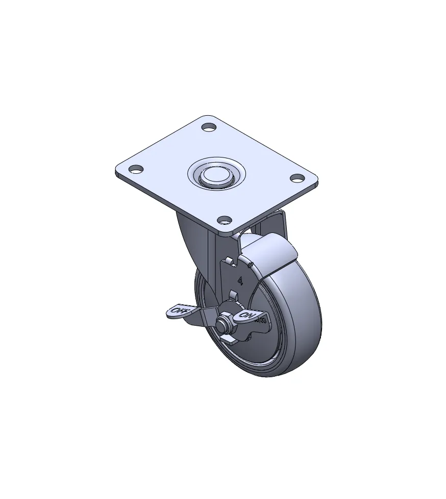 配有側(輪)煞式,鎖定係統的腳輪。底板鉚合沖壓腳架—圓孔 表面電鍍,底板式(4T)安裝裝置 耐衝擊聚丙烯輪芯,熱塑性彈性體(TPR)輪面 深灰色,輪子—中管式。